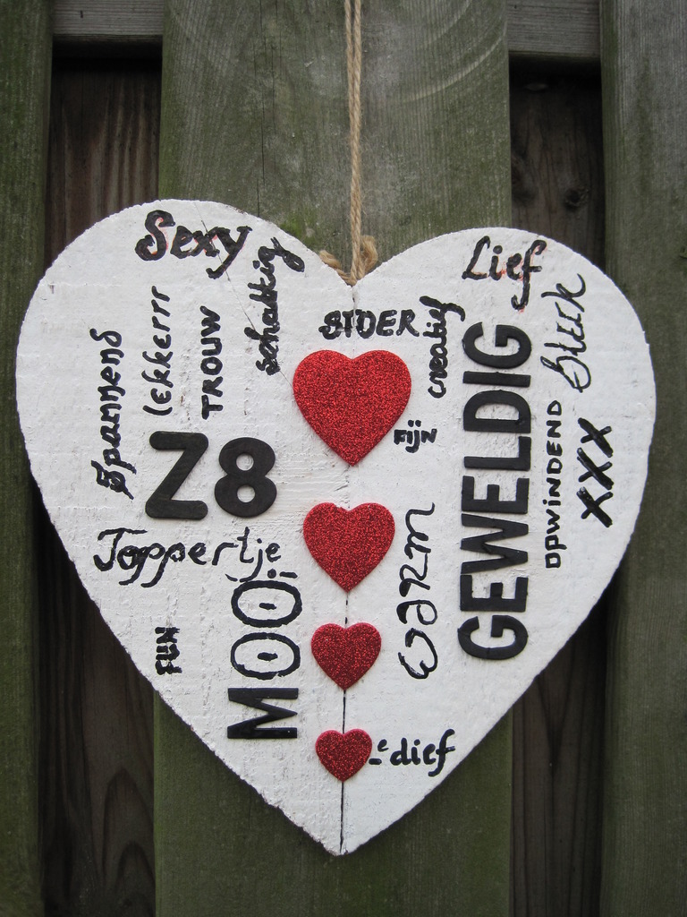 Houten hart met teksten, mixed media