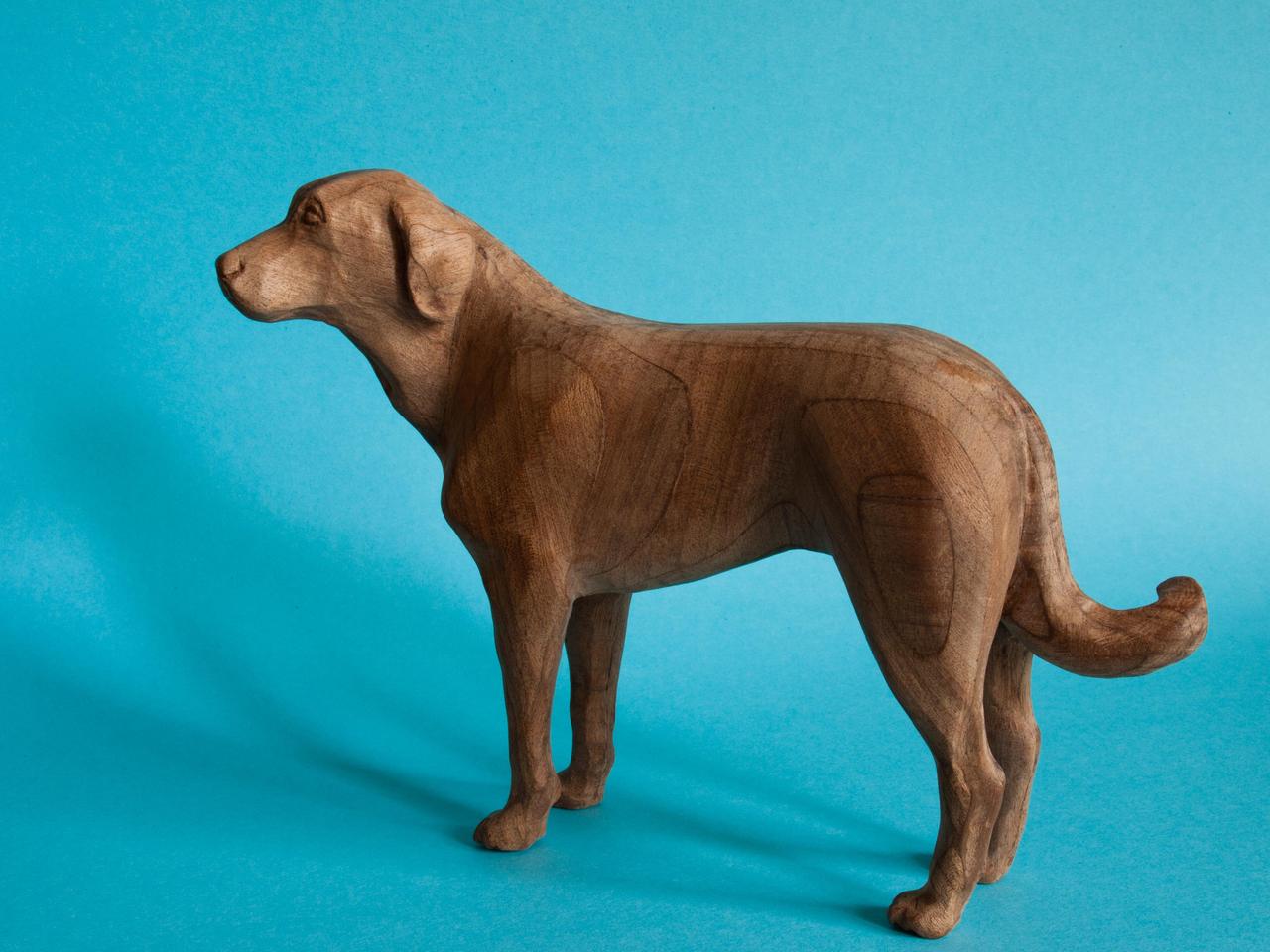 Hond 'maud' 'Maud' heeft een attente houding. De oren staan naar achter, ze wacht op een woord of aai van haar baas. De hond is gemaakt van Mahonie hout