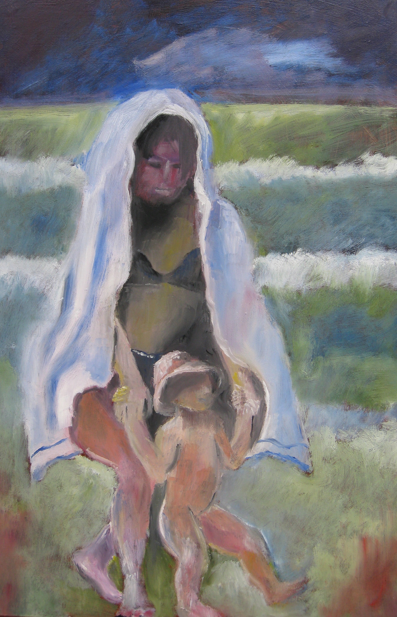 Lopen op eigen benen valt niet mee, zeker niet op het strand, maar moeder is vlakbij...