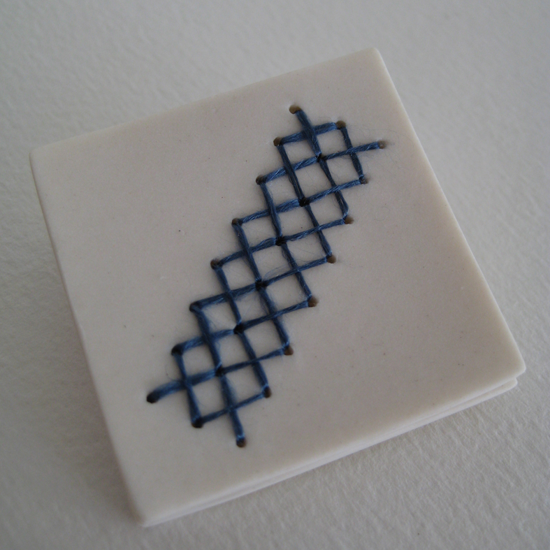 Broche gemaakt van 2 lagen porselein, waarbij de bovenste laag bewust met een glooiende beweging. De bovenste laag is geborduurd met blauwe zijde in een kruissteek. ongeglazuurd Zilveren baret(speld)