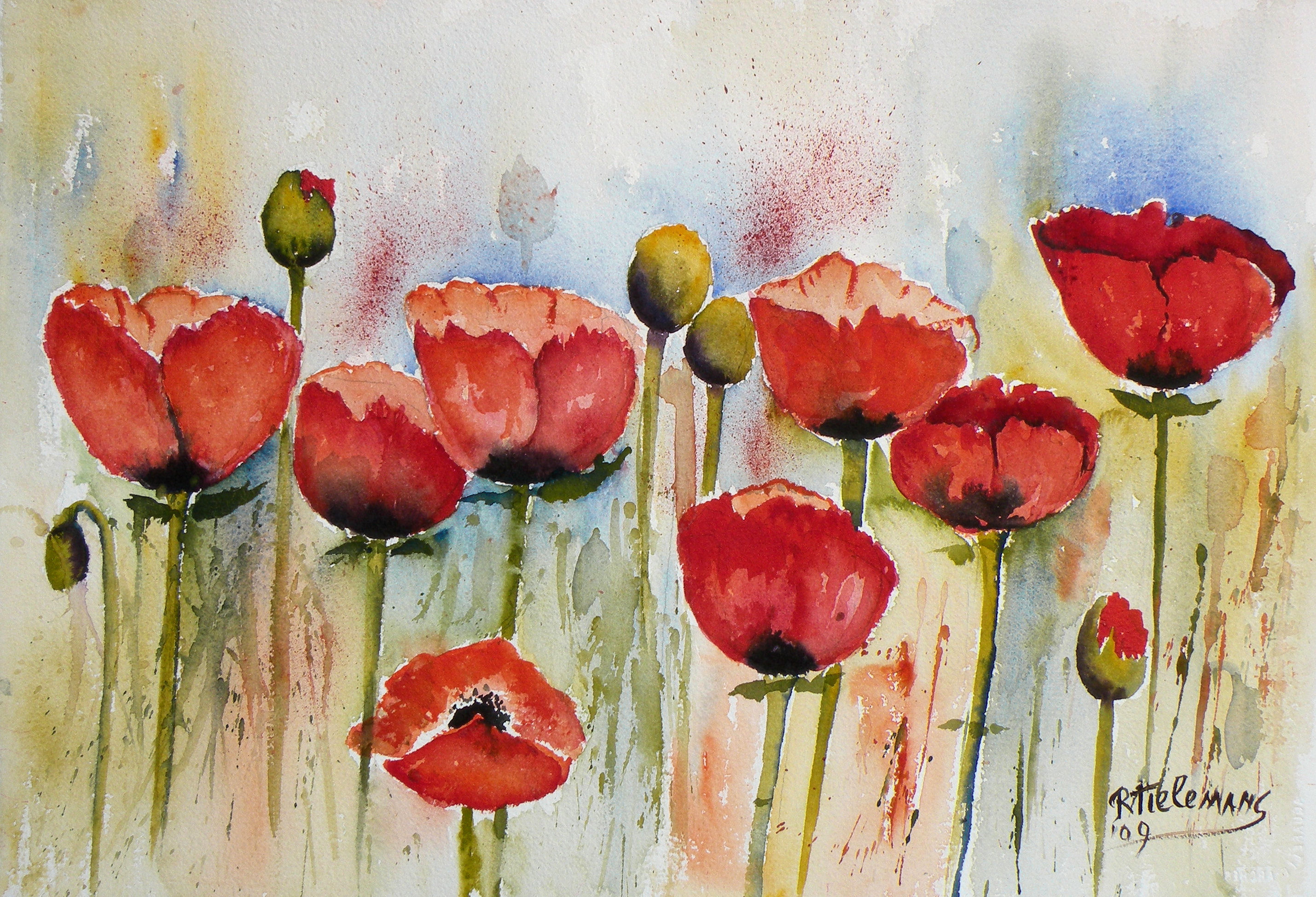 Wit Figuratief Grijs Rood Zwart Groen Bruin Papier Tuin Aquarel Realistisch Natuur Bloem Red Green Black Plant White Brown Flower Paper Papaver Garden Nature Realistic