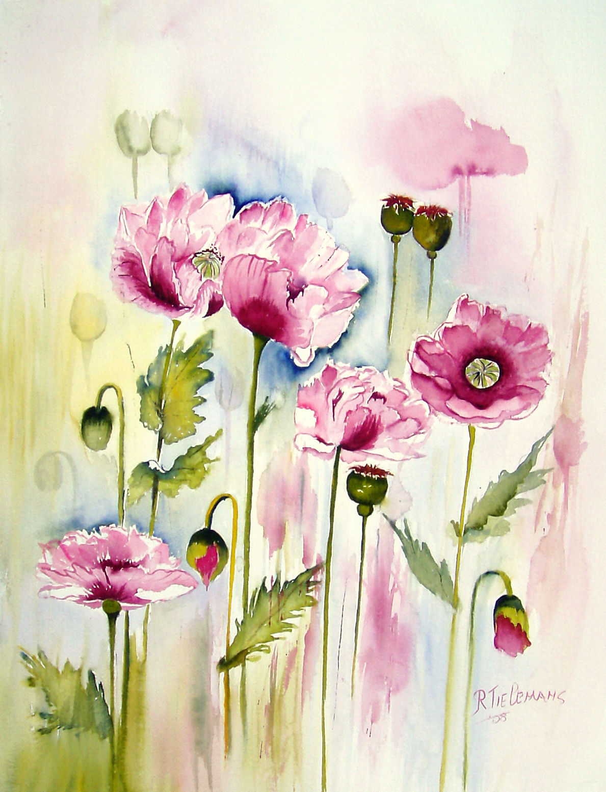 Roze Papavers, aquarel van bloemen