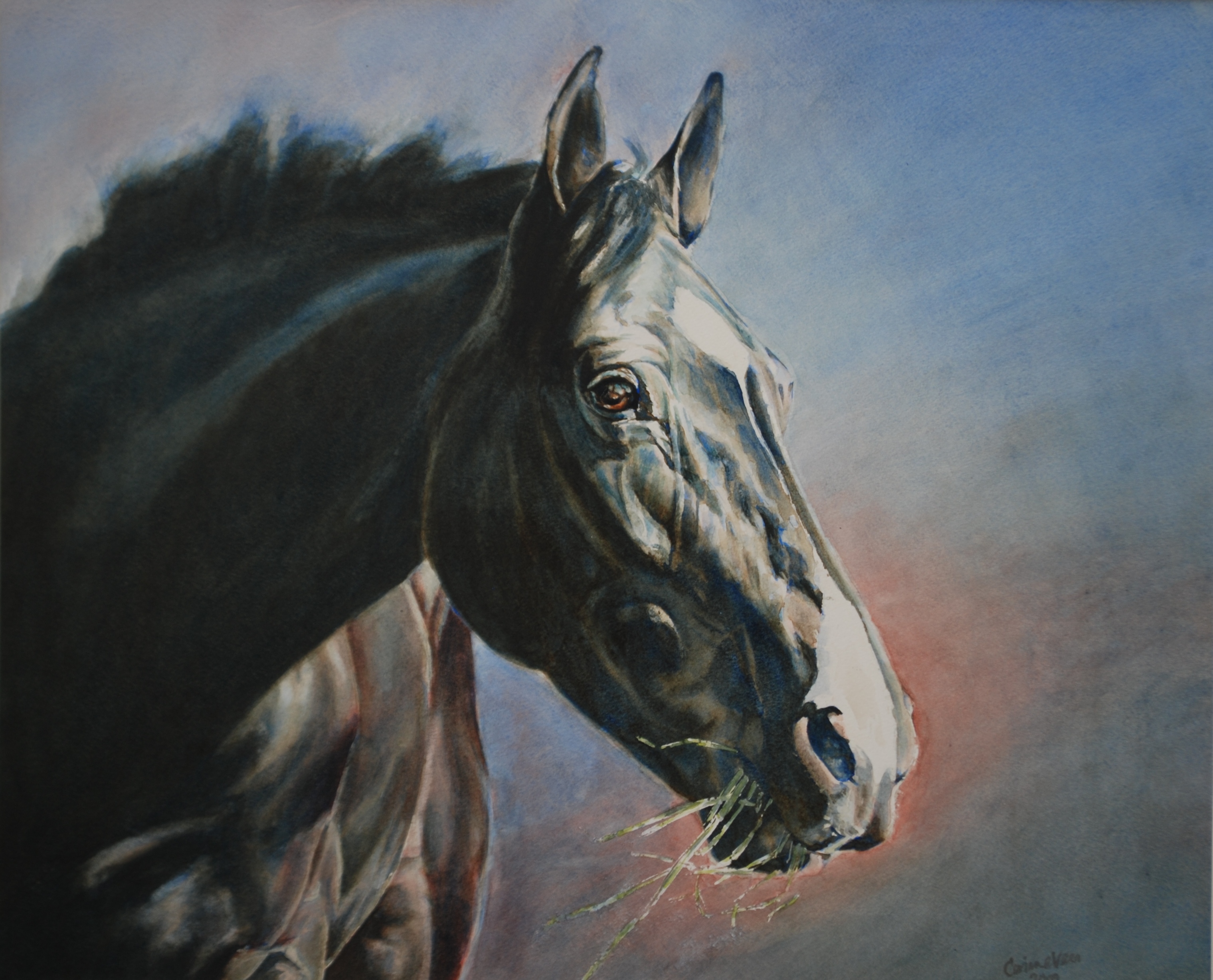 Serie Paardenportret. Spekkie, kouwend op gras. Voorbeeld van een halfbody met hoofd. Ingelijst 80 x 60 cm