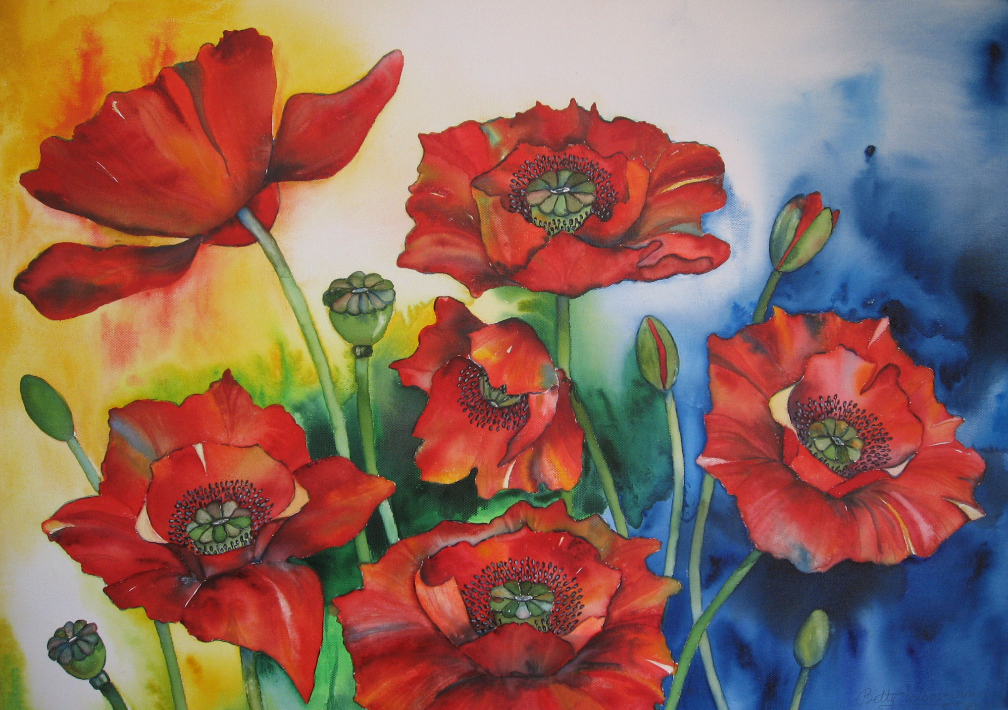 Papaverbloemen met een veelkleurige achtergrond. Aquarel door speciale techniek op doek geschilderd.