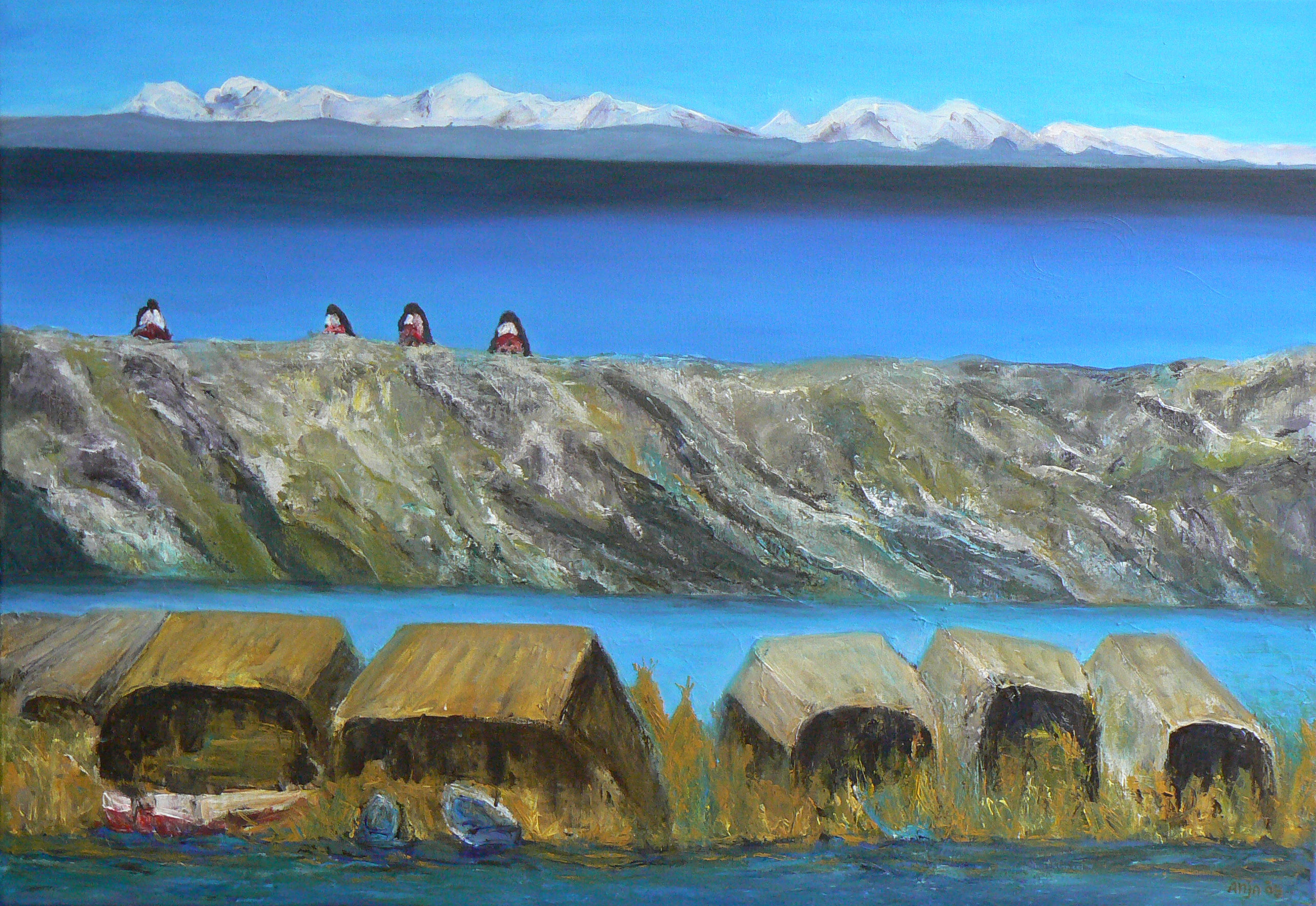 Drie impressies van het Titicacameer in één schilderij.