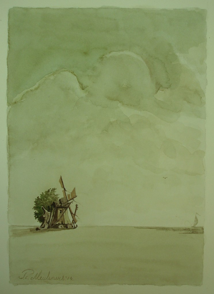 Molen Eenzaamheid Kaars Boom Vogel Schip Zee Wolken Realisme Fantasie Romantiek Papier Aquarel