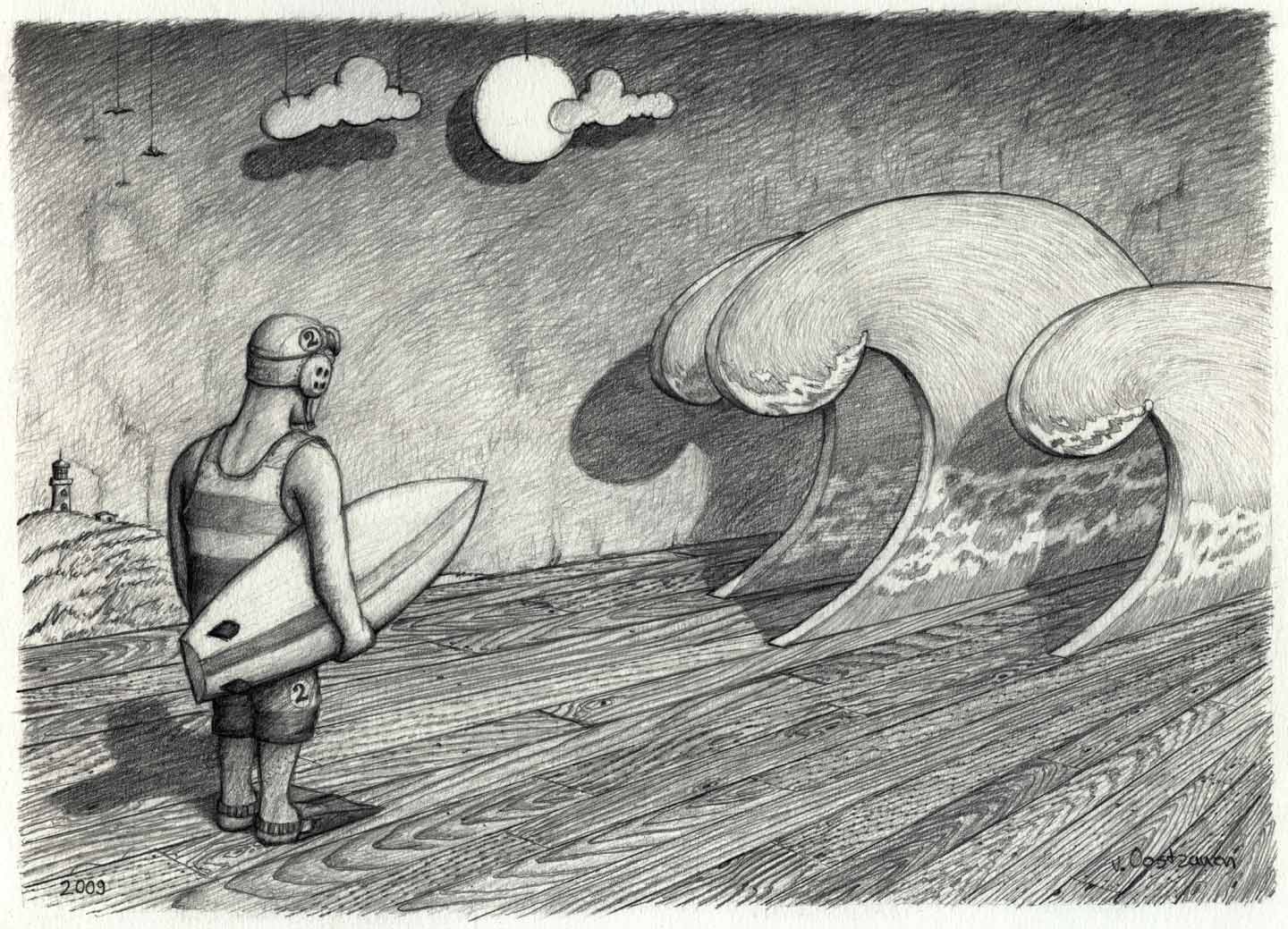 ''Het wachten is op de juiste golf.' Magisch realistische zwart wit potlood tekening op papier