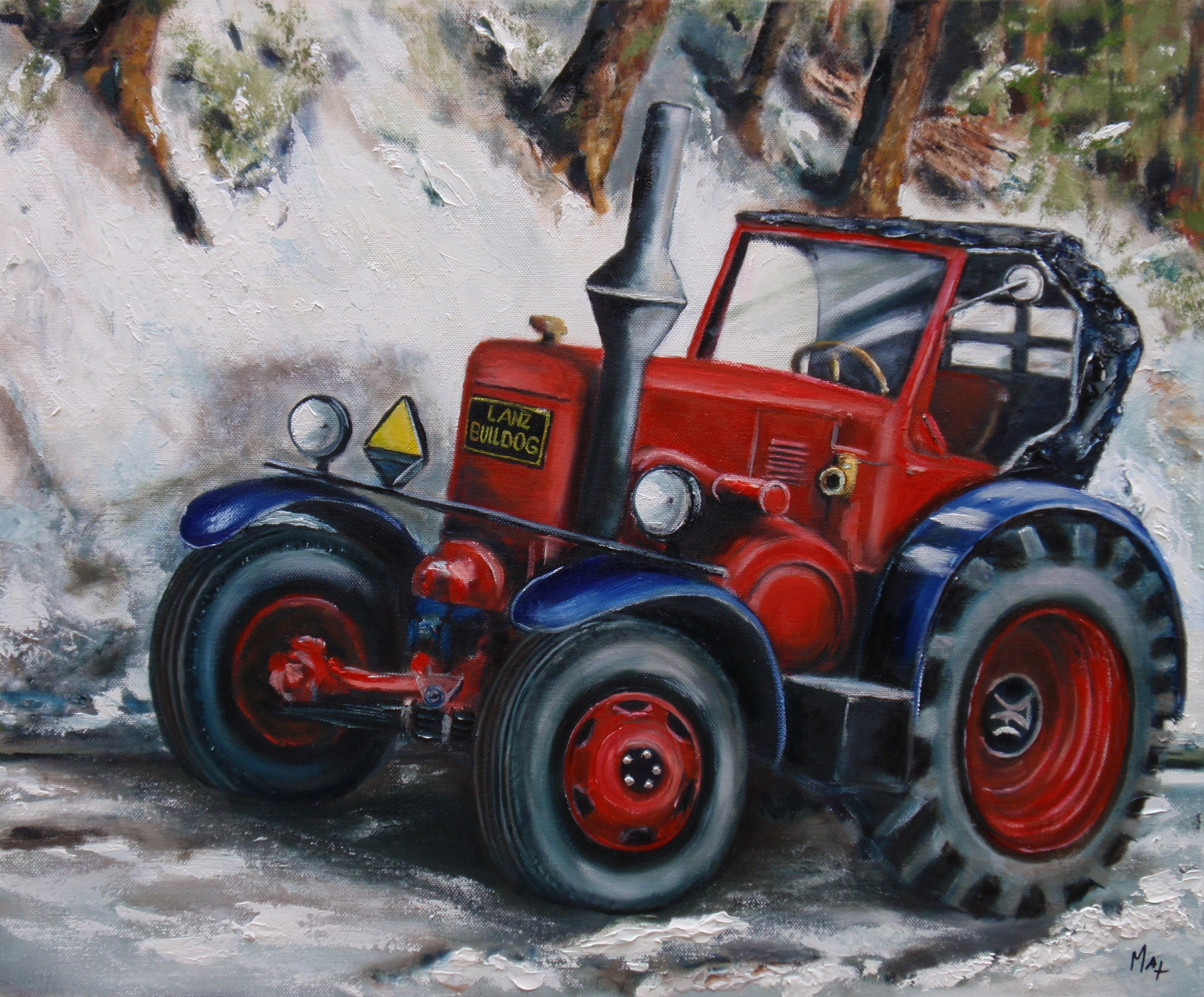 Een Lanz bulldog op een besneeuwde winter dag , ook in zeef druk te koop.
