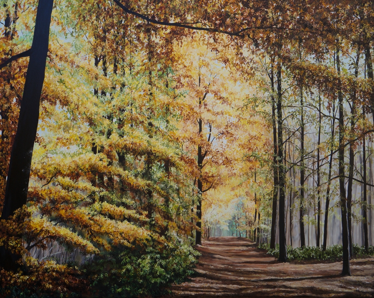 Olieverfschilderij van een bos met gele bomen.