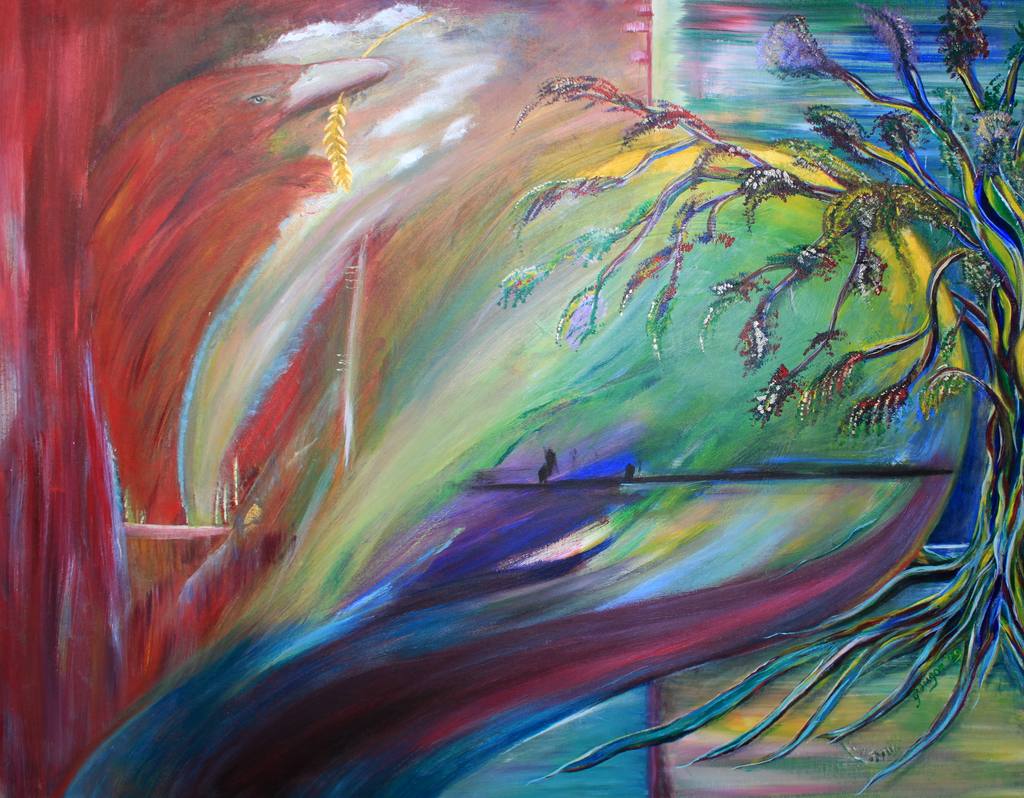 Verrijkt met glinsteringen en delen van goudverf en parelmoer. Horizons gaat over de diverse keuzes die we hebben in het leven en hoe elke keus mogelijk een totaal ander soort leven kan betekenen.