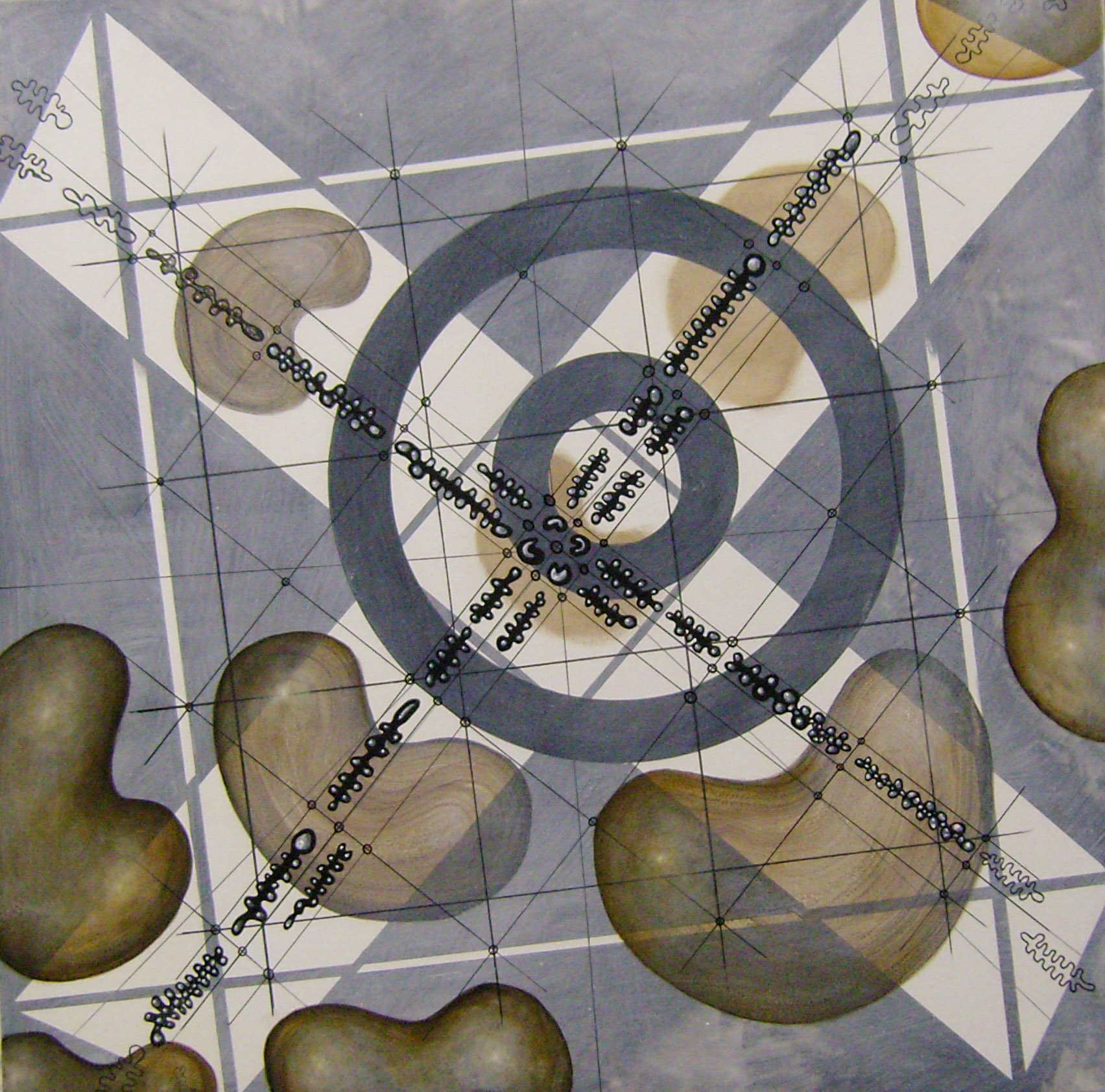 Thema: Chaos (Geometrische Chaos) Mijn kunst is beïnvloedt door de moderne wiskundige en wetenschappelijke benadering van het begrip complexe orde van de natuur. Met name heb ik me verdiept in de Chaos theorie en de fractal geometrie. Ik ben geen wiskundige, en ik gebruik geen wiskundige formules. De ideeën van de Chaos theorie en fractal geometrie leiden tot de ontwikkeling van de composities in mijn werk. Ik gebruik driehoeken,vierkanten en cirkels in mijn schilderijen, maar in mijn huidige serie, geoChao richt ik me alleen op de vierkanten en de verhoudingen tussen de vierkanten. Ik ontwikkel mijn composities door kleine vierkantjes op grote te zetten of grote op kleine te zetten. Het gaat om de onderlinge verhoudingen tussen de vierkanten. Ik laat de methode die ik kies de compositi