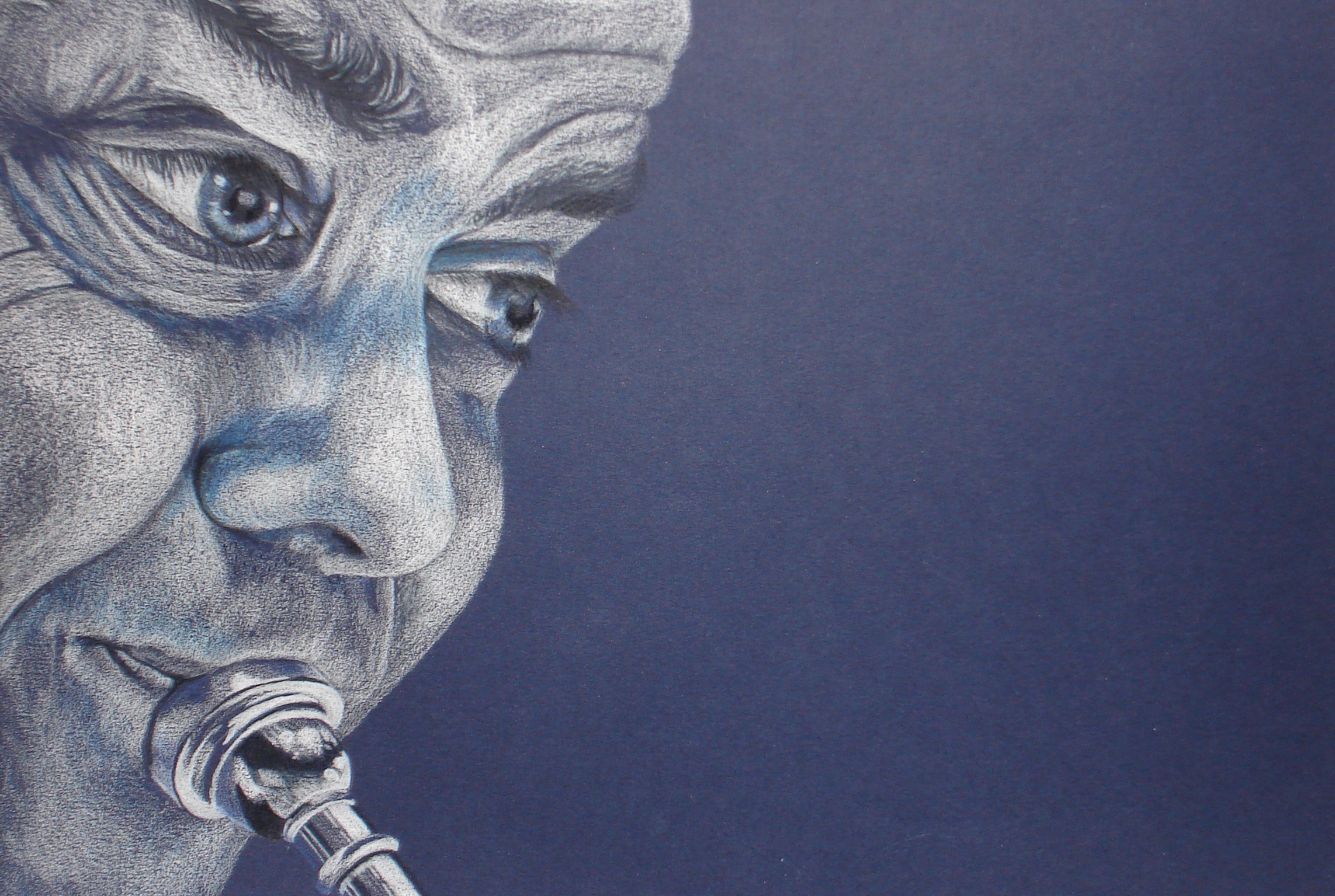 Muziek Pastelpotlood Concert Trompet Muzikant Gezichtsuitdrukking Potlood Blauw Wit