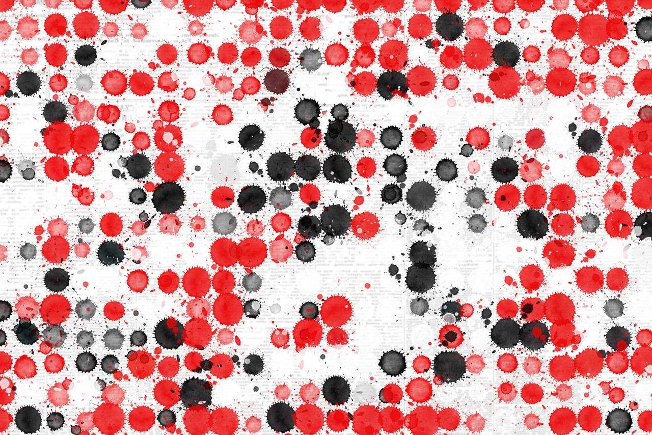 Spetters in de kleuren rood wit en zwart op witgeschilderd krantenpapier. Passie, bloedrood, zakelijk, daadkrachtig. Welke associaties heb jij? Kleuren hebben een psychologische betekenis. Er bestaan verschillende lijsten met de betekenissen van kleuren. De kleuren uit de omgeving oefenen een zekere invloed op onze gesteldheid uit. Rood maakt actief en gespannen, terwijl het groen van een bos juist rust weet te geven, geel bevordert een opgewekt gevoel. Elk jaargetijde heeft zijn kleuren. Oranje en bruin voor de herfst, roze en lichtblauw voor de lente. Dit werk en andere werken met druppels zijn verkrijgbaar via http://www.werkaandemuur.nl/index/135/nl/Verf-spetters/gallery/2899/6777/0/date_desc