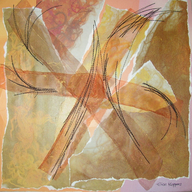 Lagen transparante stof over karton en papier waarover spontane stiksels.