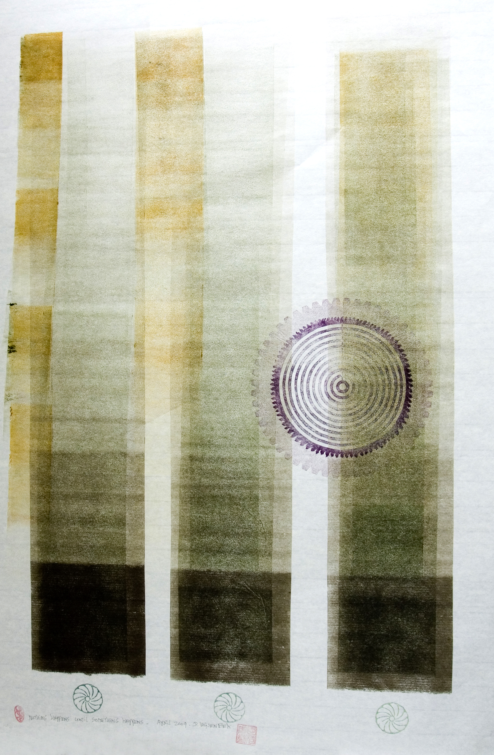 Donald Wijsenbek (1938) is al sinds zijn jeugd gefascineerd door tandraderen. Deze zijn voor hem een inspiratiebron bij het maken van aquarellen en handdrukken, waarbij hij deze vormen als grondpatroon gebruikt.