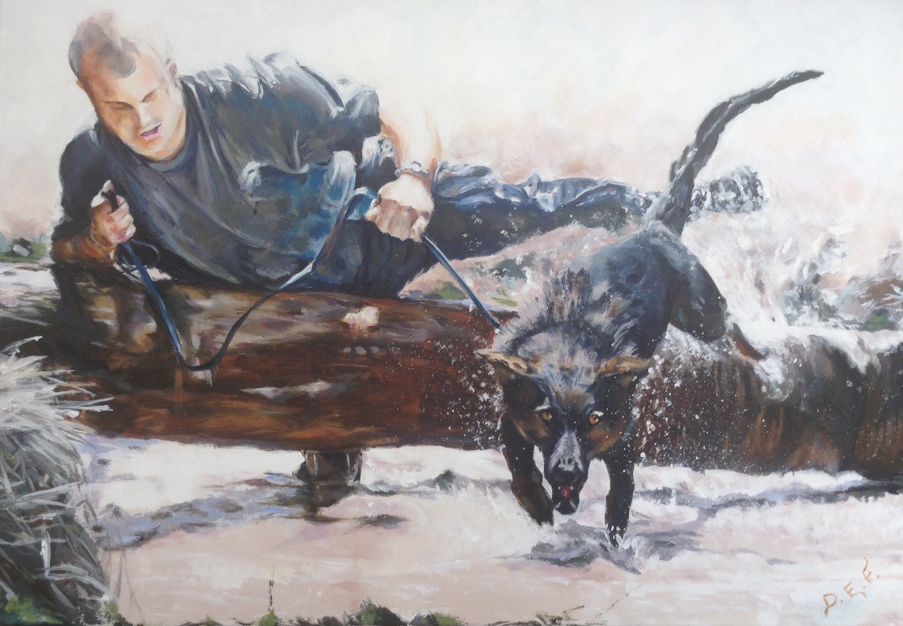 Een hond en zijn baas. Samen in achtervolging; samen op training.