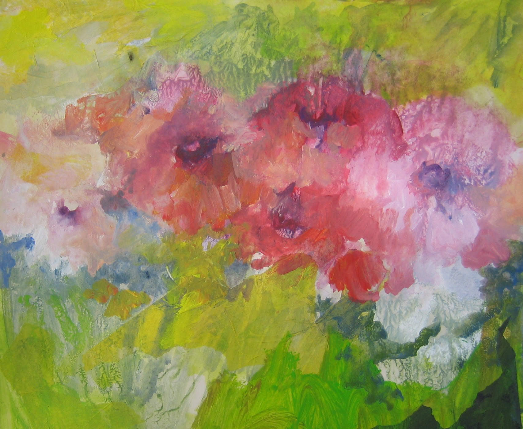 Deze zomerse bloemen zijn in acryl op kartonnen paneel geschilderd, maar op een soepele en losse manier, waardoor het werk het onverwachte van een aquarel krijgt. Er is ook met collage gewerkt.