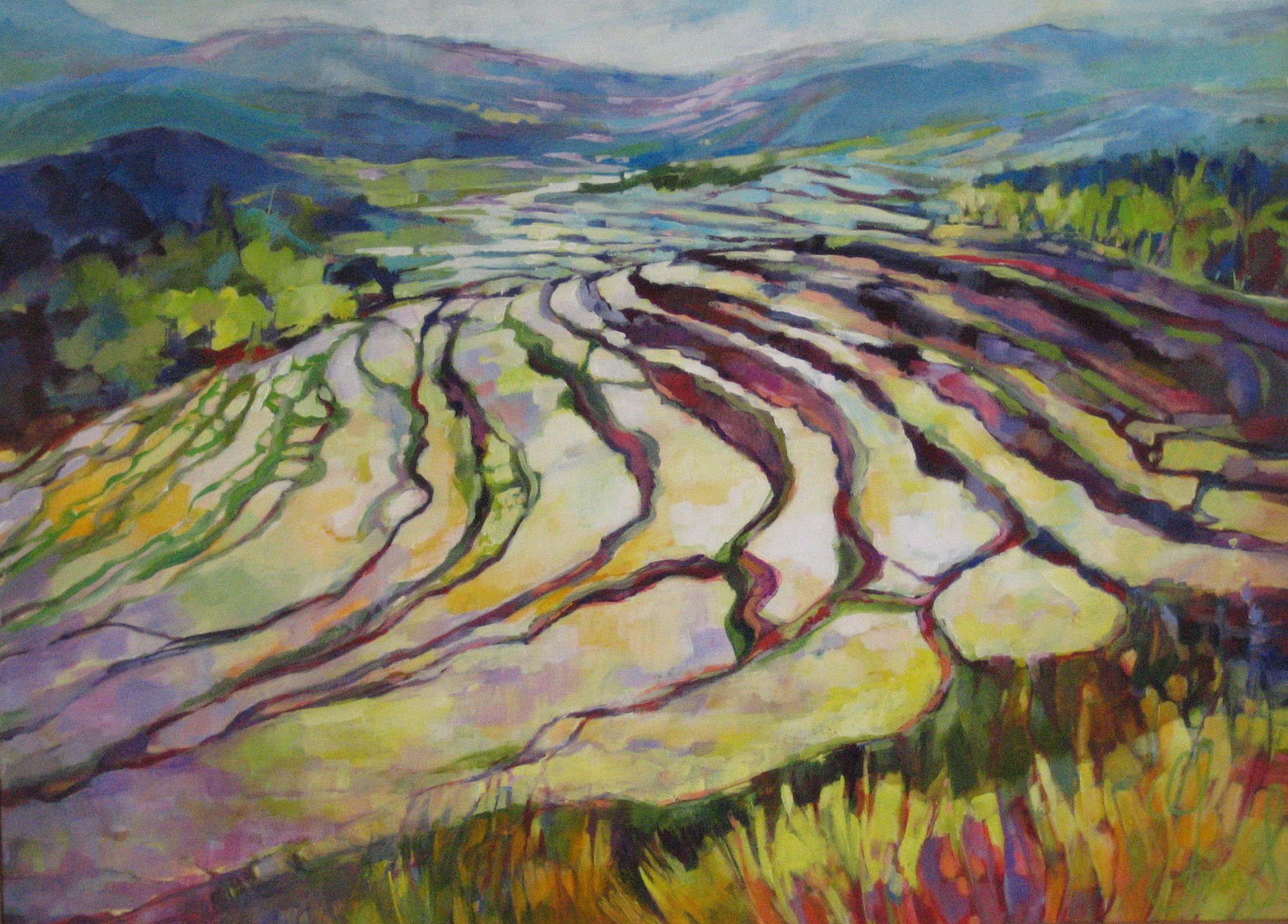 De rijstvelden zijn in eerste instantie ter plaatse in Indonesië aan het einde van de dag getekend en geschetst. Later in het atelier verder op het doek uitgewerkt en geschilderd.