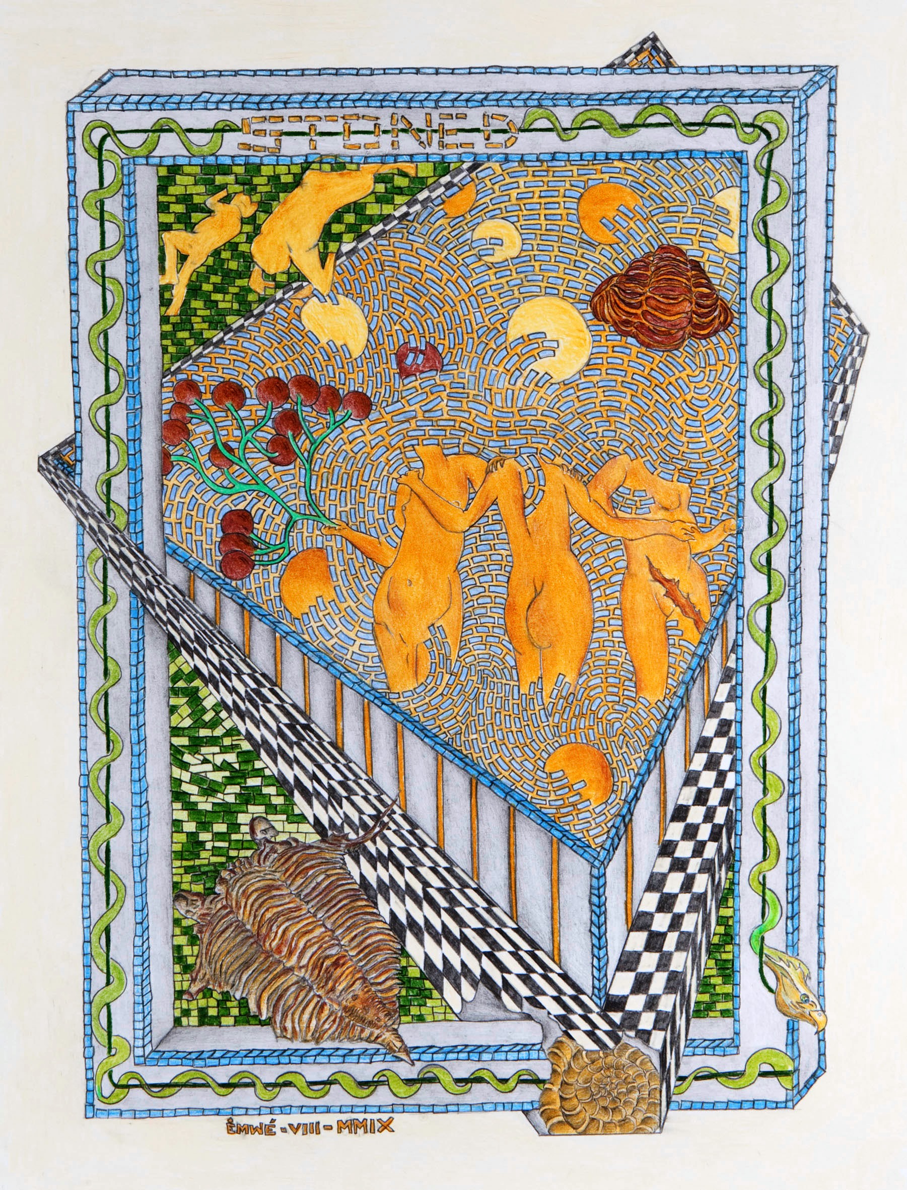 Fossielen(trilobieten en een ammoniet) en versteende lichamen in Pompeï en dansende naakte vrouwen in een badhuis in Herculaneum. In een mozaiek verwerkt.