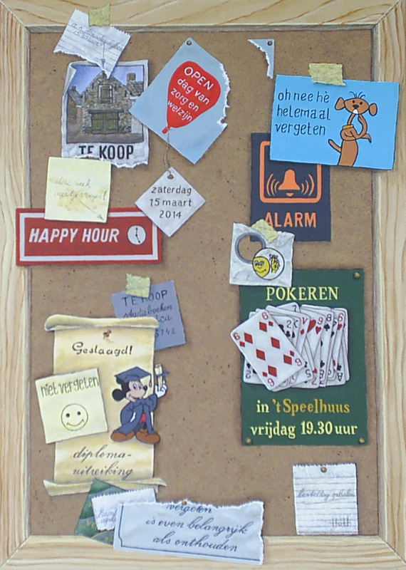 geheugensteuntje zoals dit prikbord kan heel handig zijn. In trompe- l'oeil stijl geschilderd van aankondigingen en dingen wat niet vergeten mag worden.