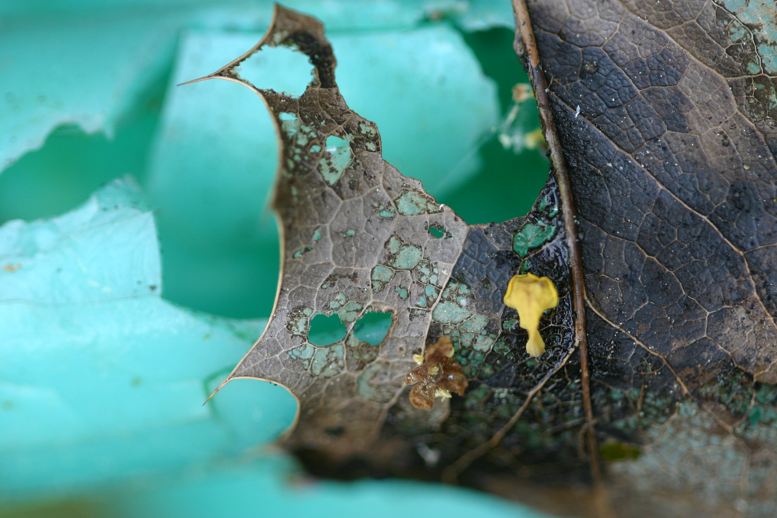 Close-up van een herfstblad op een plastic voorwerp.