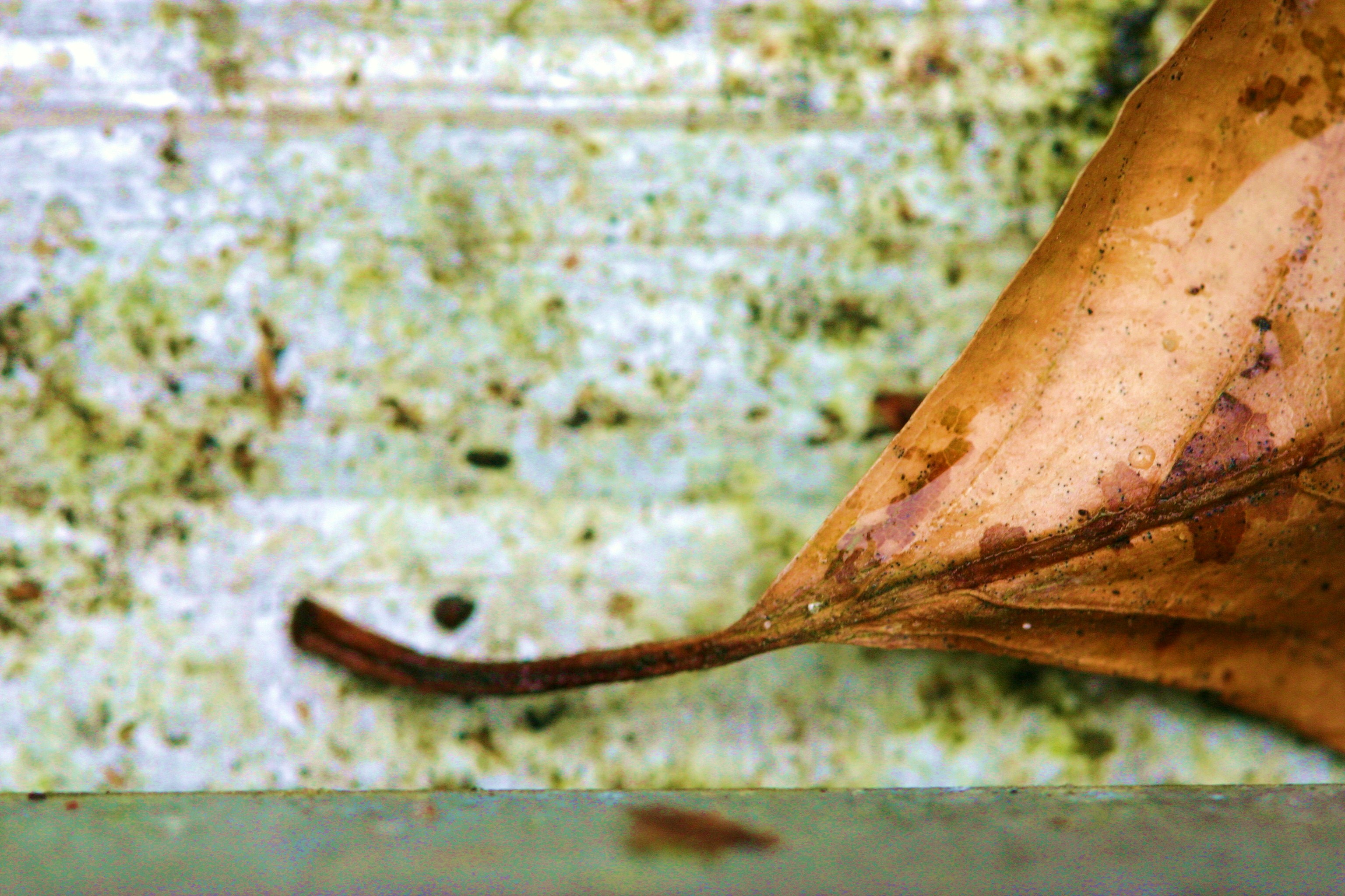 Close-up van een vochtig blad liggend op een metalen voorwerp.