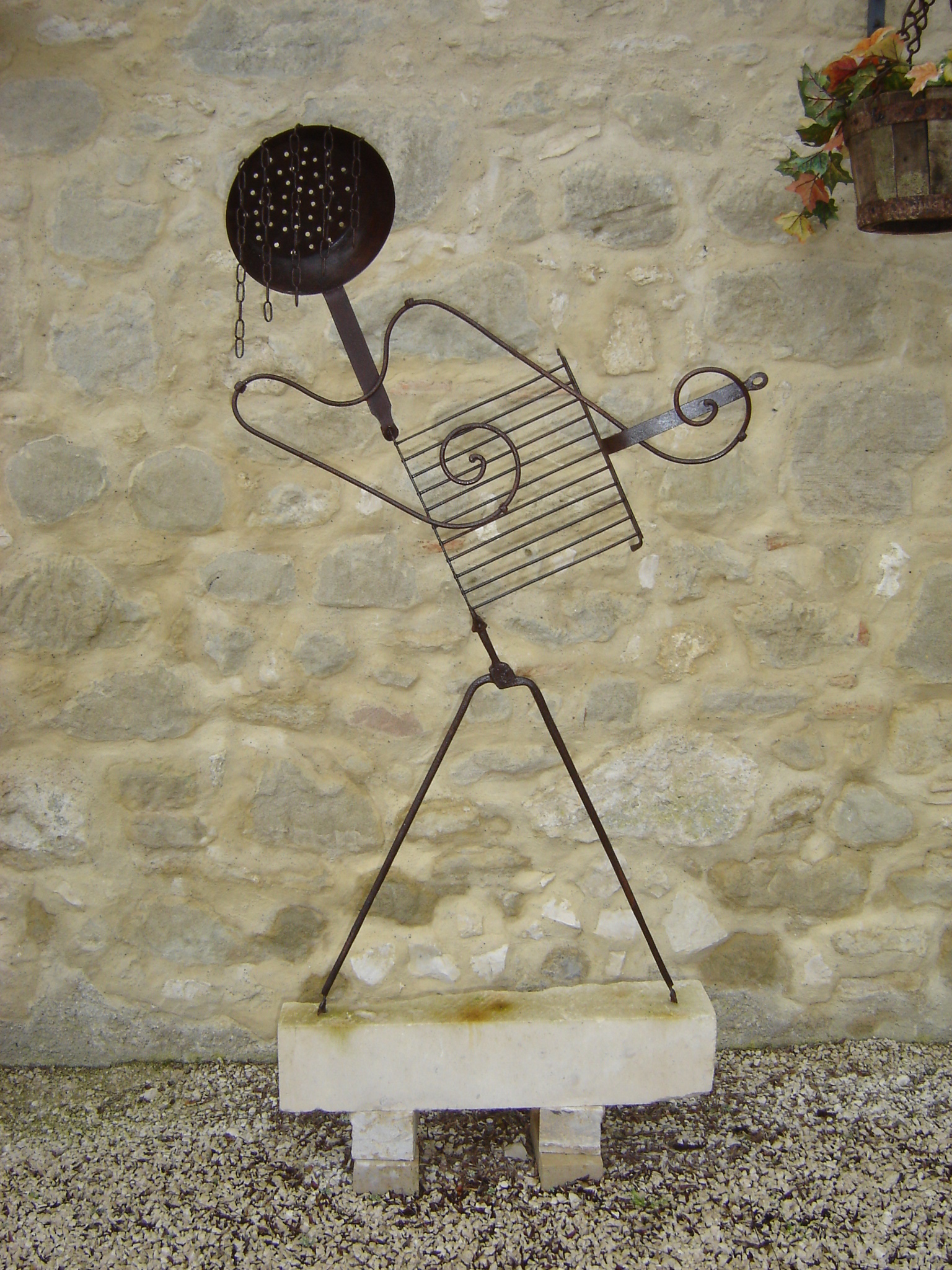 gitarist opgebouwd uit oud ijzeren materialen zoals een kastagnepan, houtblokkentang, grilrooster en kettingen. Ode aan Johnny Hallyday.