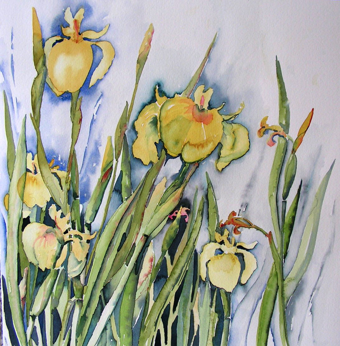 stukje gele lis van langs de slootkant, op locatie geschilderd, ingelijst in passe partout en aluminium lijst mat zilver