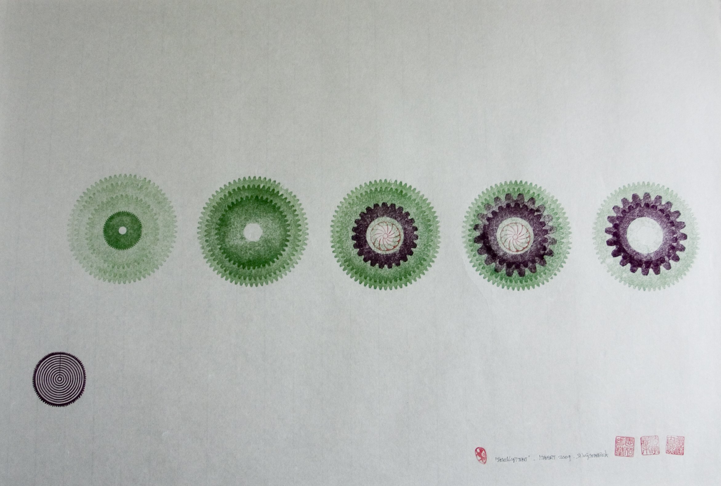 Donald Wijsenbek (1938) is al sinds zijn jeugd gefascineerd door tandraderen. Deze zijn voor hem een inspiratiebron bij het maken van aquarellen en handdrukken, waarbij hij deze vormen als grondpatroon gebruikt.