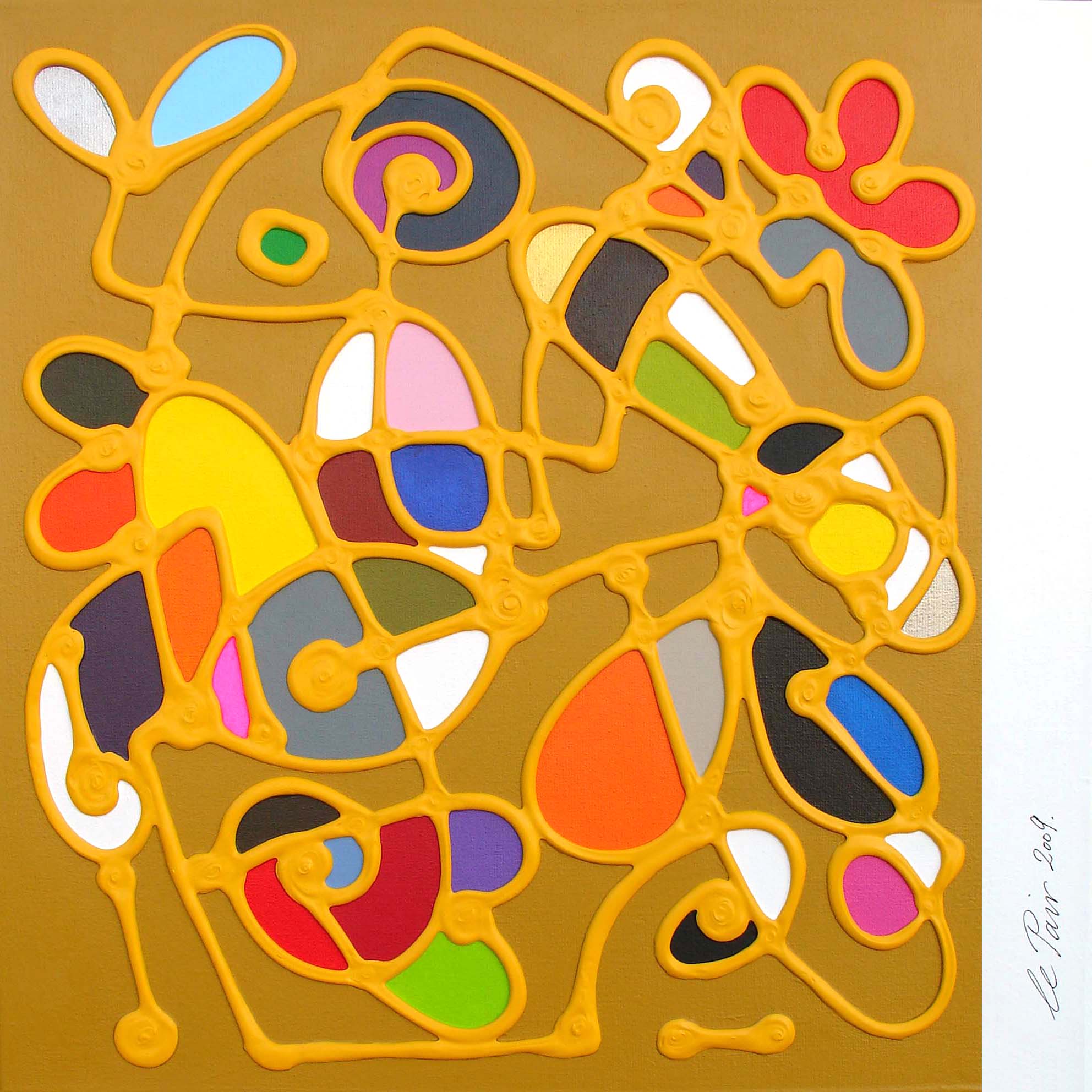 Frank le Pair (Eindhoven 1965) Landschappen van gestileerde vormen, vrolijke kleuren en een krachtige lijnvoering in relief. Natuurstructuren in ongedwongen serene sferen, geveegd, gekrast in transparante lagen. Het is de eenvoud in lichtval en schaduwwerking die verrast.