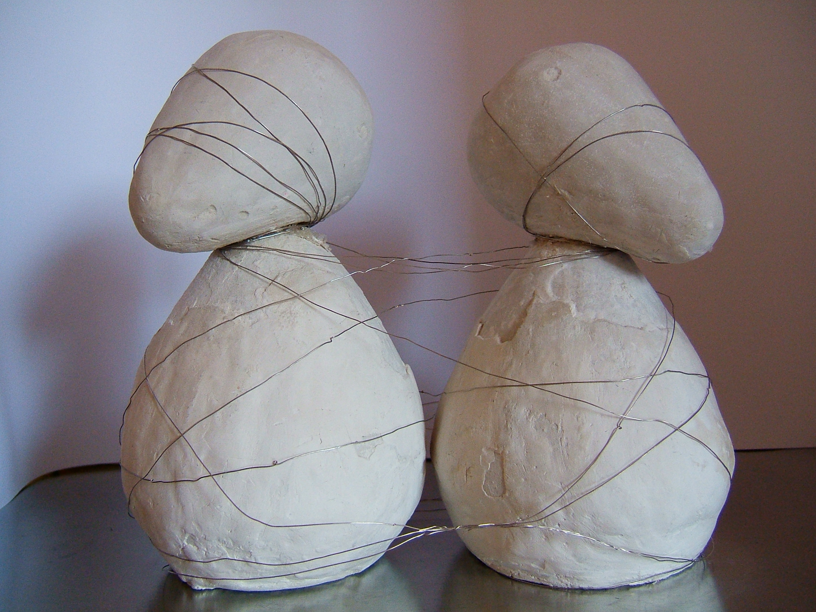 Dit werk heb ik een paar jaar geleden gemaakt als opdracht voor het vak CKV. Mijn inspiratiebron waren de kunstwerken van de beeldhouwer Constantin Brancusi. Het werk bestaat uit twee beelden en een onderplaat. De beelden zijn gemaakt van klei gecombineerd met ijzerdraad. De onderplaat is van zilverkleurig metaal. Het werk stelt twee mensen (vrienden) voor. Soms kun je heel verschillende wegen opgaan en elkaar (letterlijk) niet meer zien staan. Toch blijf je verbonden door de herinneringen die je samen deelt.