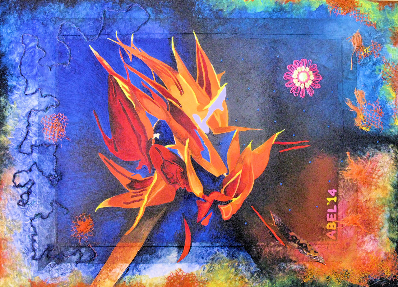 Bloemen, scherp als een doorschijnend landschap waar je doorheen kunt lopen. Transperantie, doorschijnenedheid, lichtheid tegen een diepe achtergrond, puur, echt , met plezier gemaakt, met verscheurde stukken verweven en verwerkt. Los gelaten van regels, gedachten en hoe het zou moeten, op gevoel.