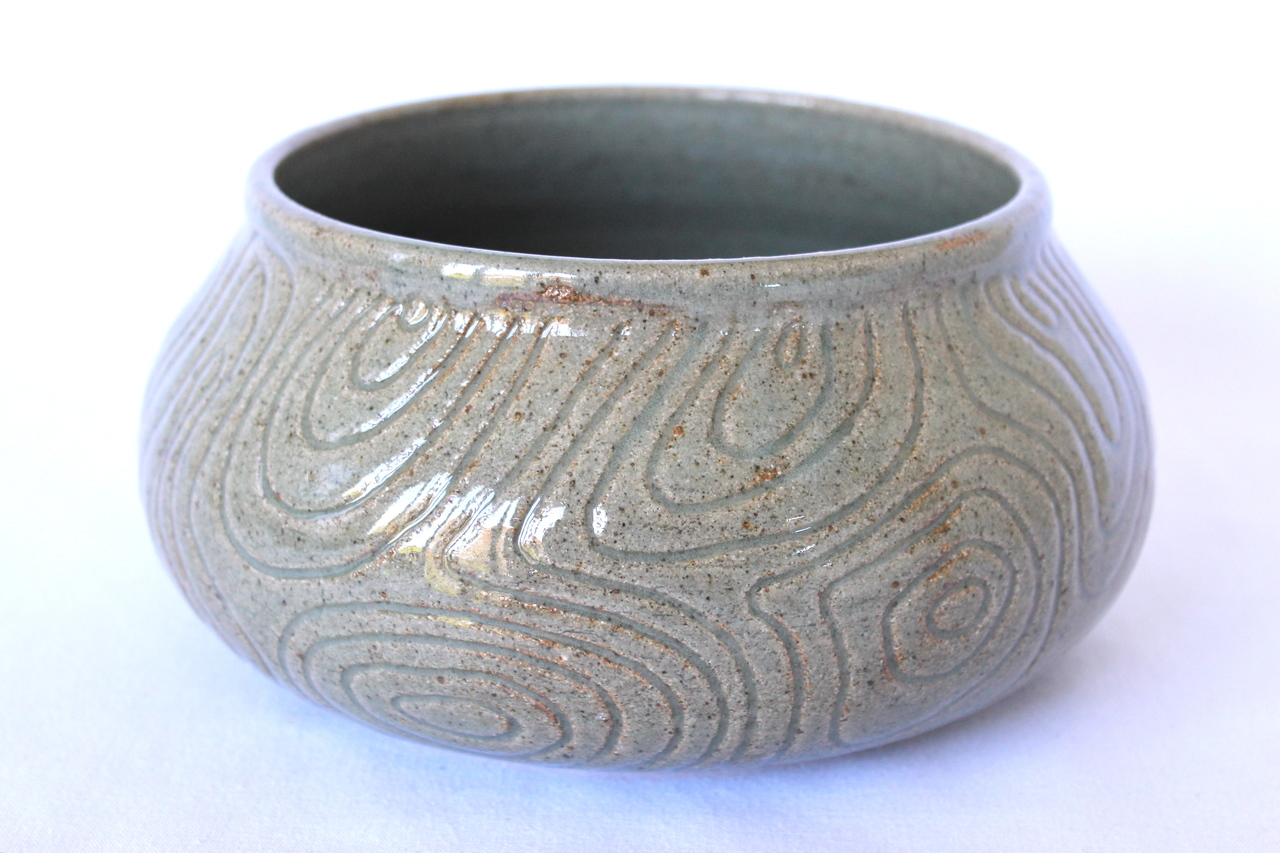 gedraaide kom, ingesneden geometrische decoratie,celadon glazuur.