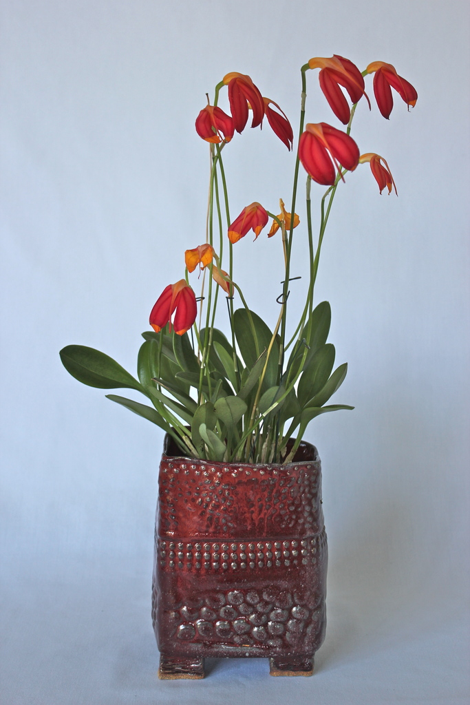 met lappen klei opgebouwde pot op voetjes, gedekoreerd met zelfgemaakte stempels, koperrood glazuur, steengoed, reductie gestookt.