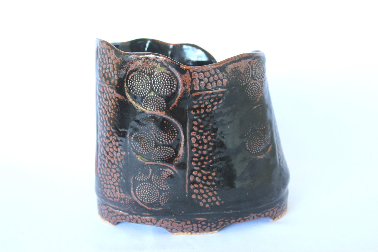met lappen klei opgebouwde pot ,gedekoreerd met zelfgemaakte stempels, temmoku glazuur,steengoed, reductie gestookt.
