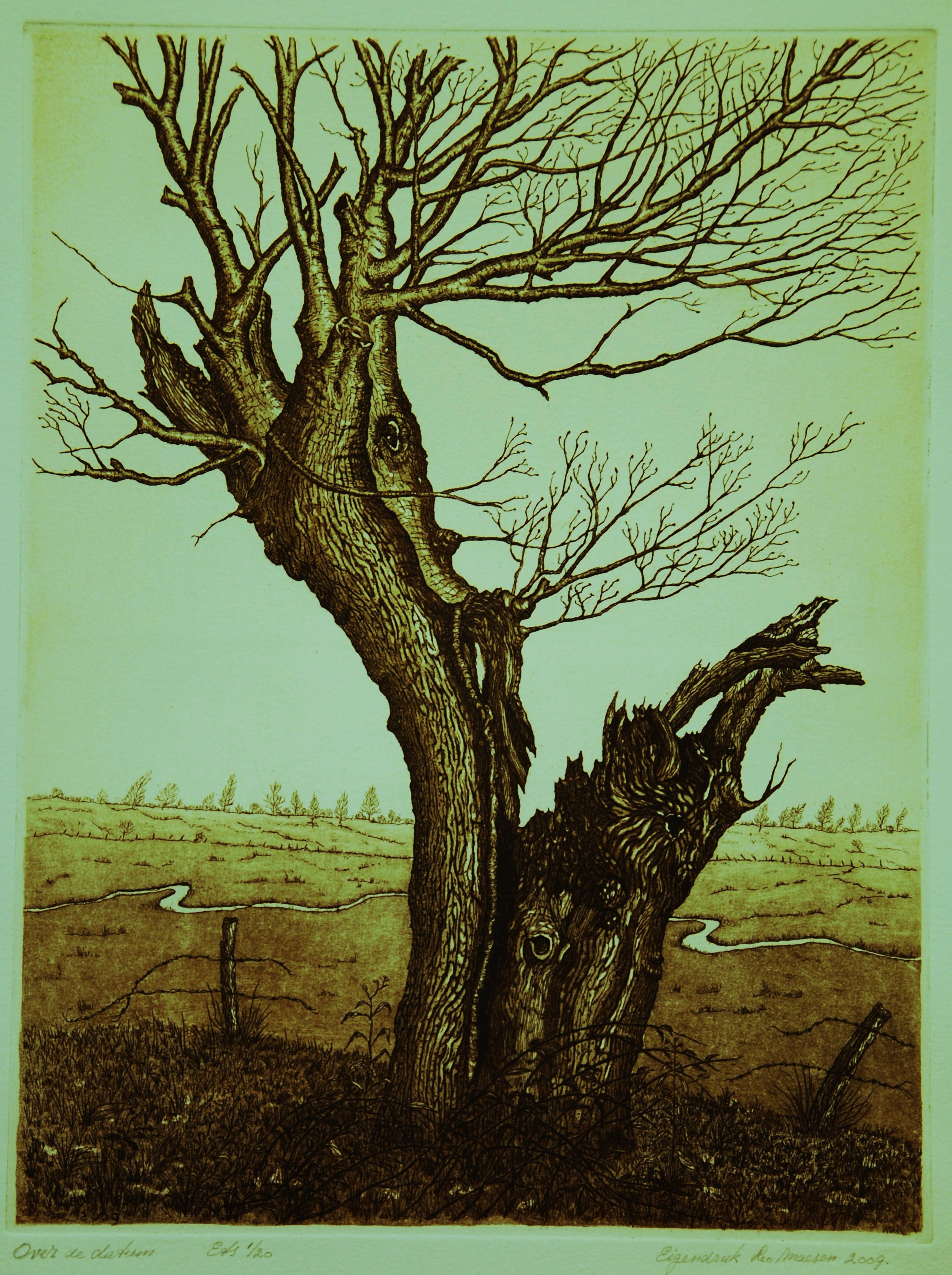 Het gedicht OVER DE DATUM van Herman Verweij heeft mij geinspireerd tot het maken van deze ets. OVER DE DATUM Hoeveel keer was er een knikje, de buiging, het volle gewicht op wat brokkelt, broos wordt. Begrenst wat belast, zoals een kurketrekker ooit zal breken, een kraakboom valt voor waaiwind: voor alles is een tijd, een beperte houdbaarheid 20 afdrukken.