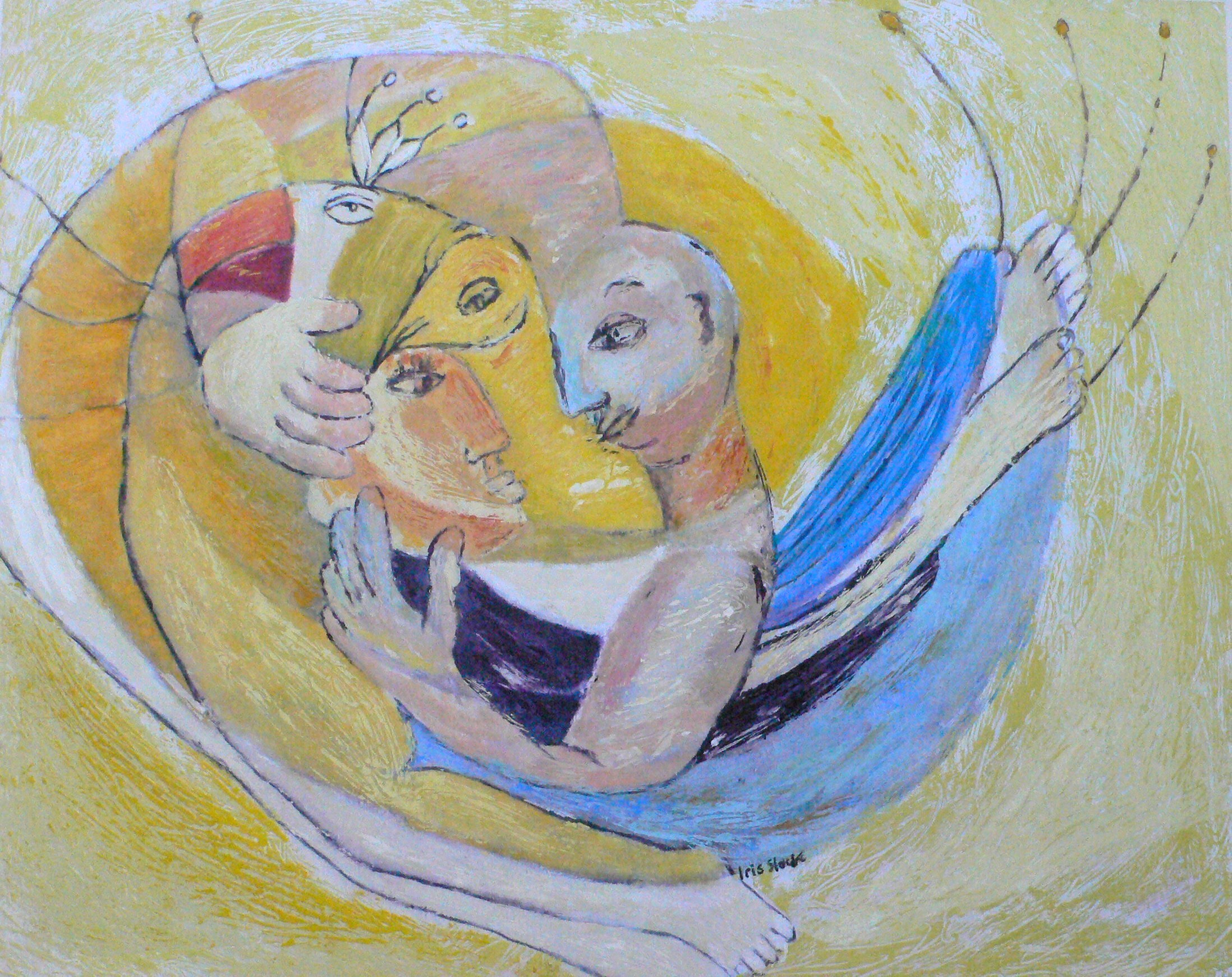 Zwevend in de lucht. Vershillende druktechnieken hierin verwerkt. Het werk is ingelijst.
