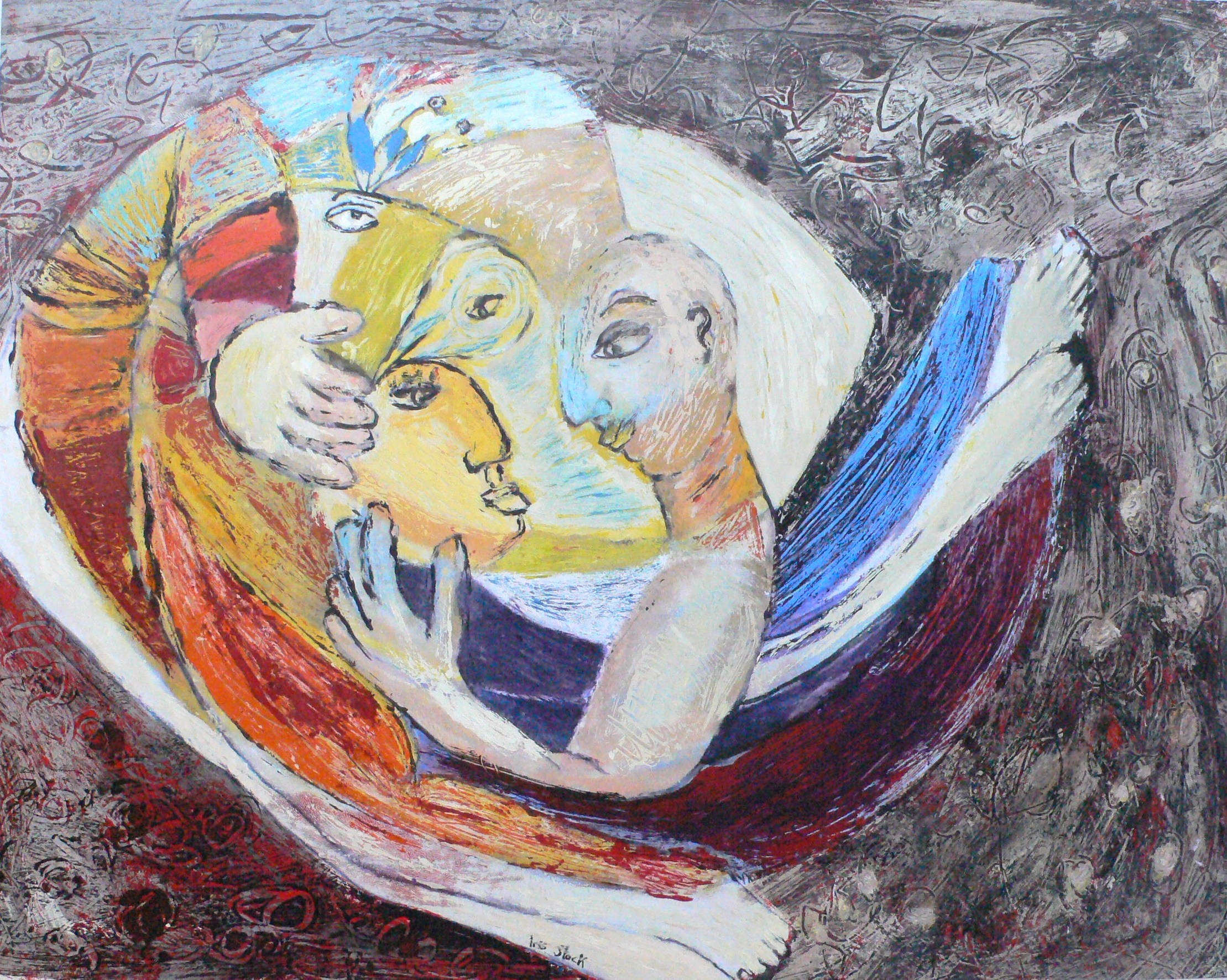 Innig. Verschillende druktechnieken hierin verwerkt. Dit werk is ingelijst.