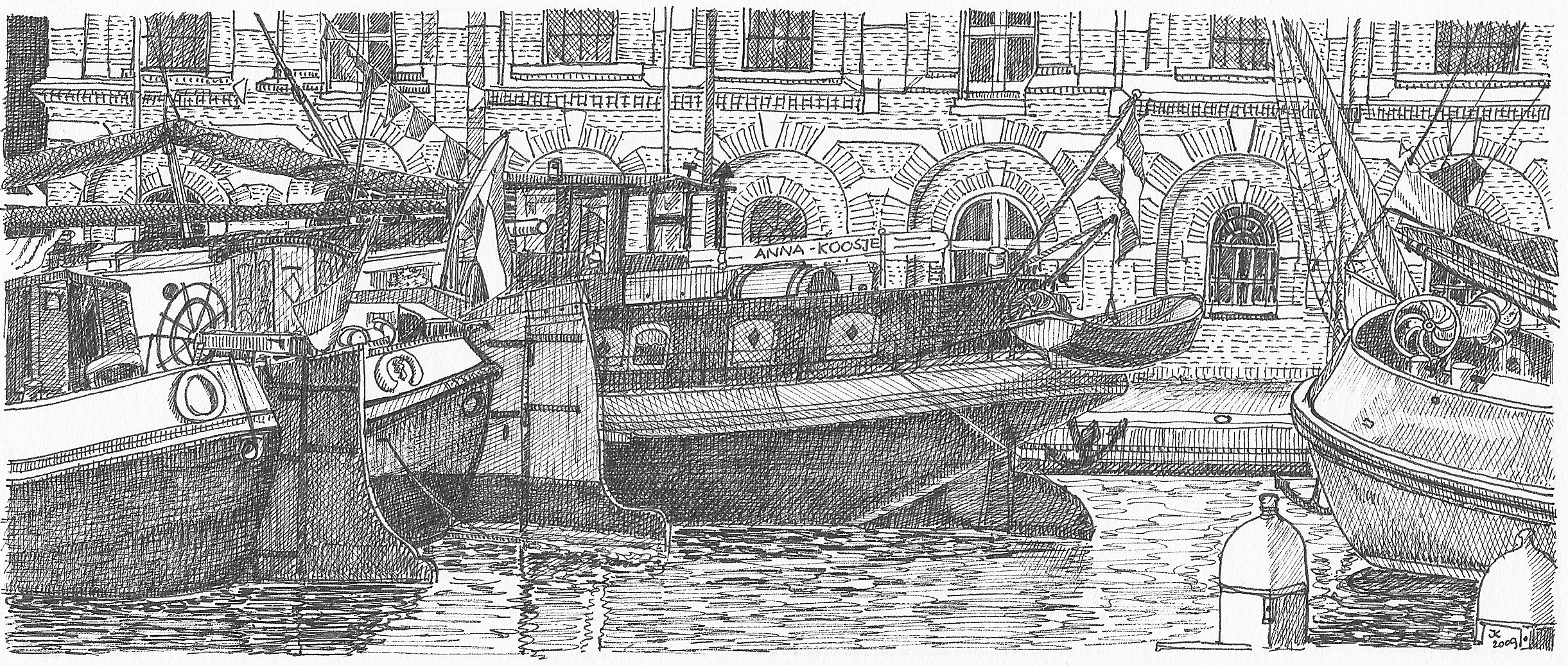 Bruin Vloot Pentekening Batavia Pakhuis Zaan Oever Realistisch Schepen Brown Ships Fleet Ink Drawing Wharehouse River Bank Realistic