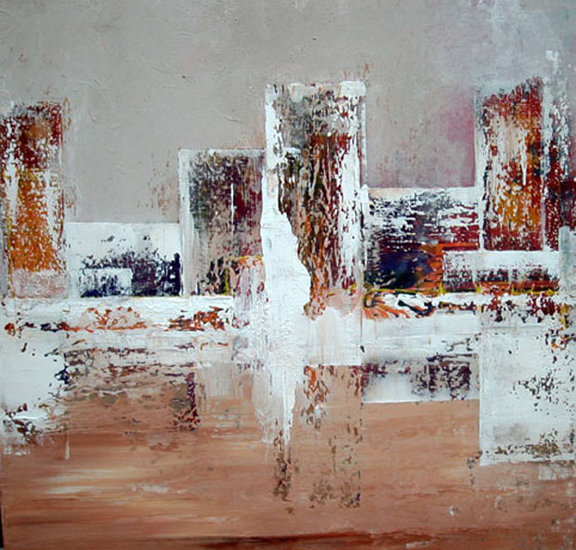Arjen van der Linden Zijn werk bestaat uit krachtig opgezette contrasten, soms samenvloeiend en dan weer elkaar afstotend. Ieder werk is een gevecht. Veelal grote doeken met thema's als stadsgezichten, landschappen en skylines geboetseerd in acryl op linnen. Frans Janssen (Kunstimpressario)