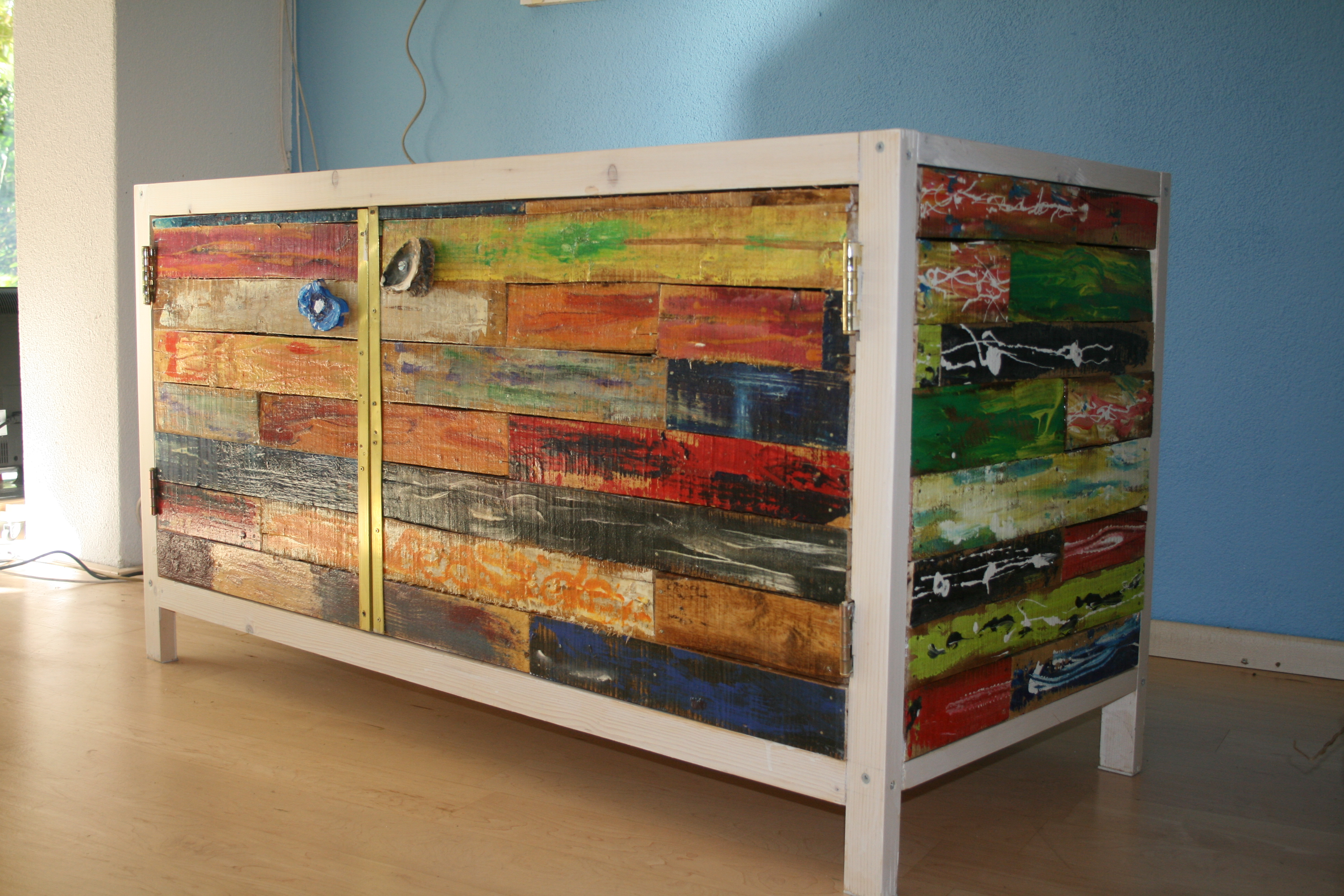 Gemaakt van o.a. stroken pallethout. De stroken zijn divers beschilderd en op sommige plekken met zand en schelpen bewerkt.