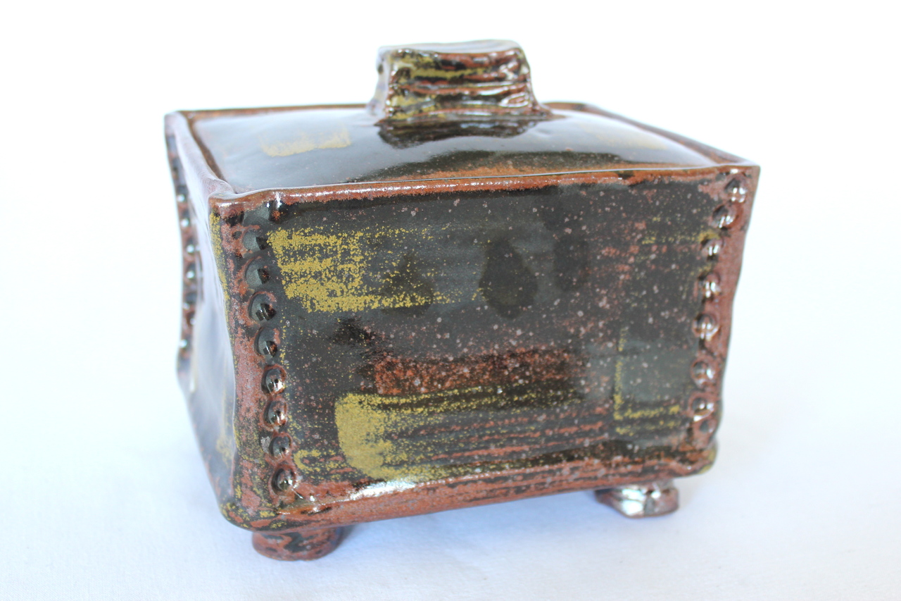 handgevormde doos met deksel, temmoku glazuur met mat wit glazuur als decoratie, steengoed, in reductie gestookt.