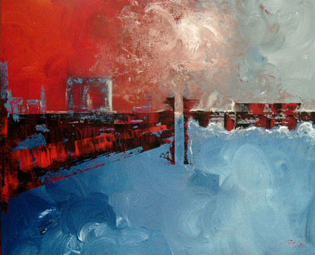 Arjen van der Linden Zijn werk bestaat uit krachtig opgezette contrasten, soms samenvloeiend en dan weer elkaar afstotend. Ieder werk is een gevecht. Veelal grote doeken met thema's als stadsgezichten, landschappen en skylines geboetseerd in acryl op linnen. Frans Janssen (Kunstimpressario)