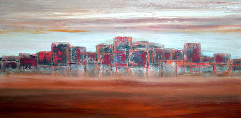 Arjen van der Linden Zijn werk bestaat uit krachtig opgezette contrasten, soms samenvloeiend en dan weer elkaar afstotend. Ieder werk is een gevecht. Veelal grote doeken met thema's als stadsgezichten, landschappen en skylines geboetseerd in acryl op linnen. Frans Janssen (Kunstimpressario)