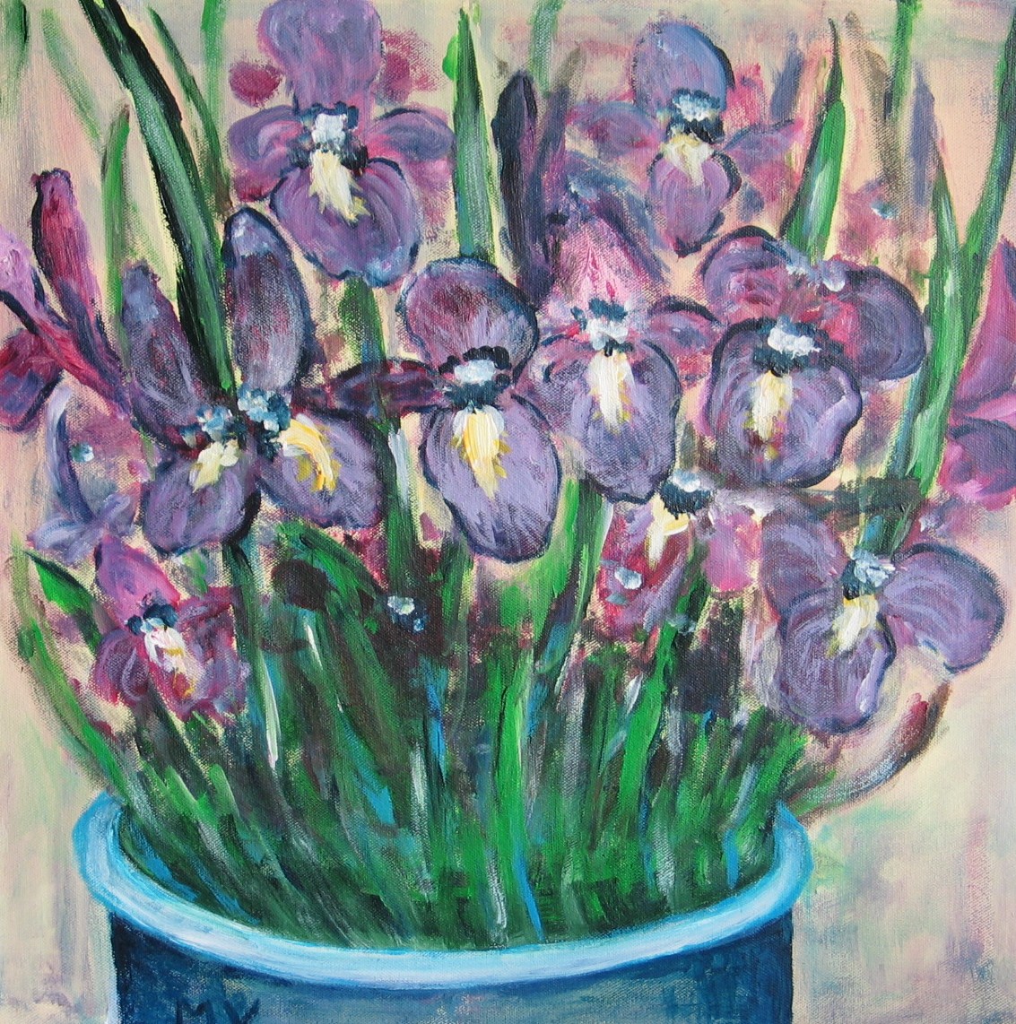 Een pot met irissen.