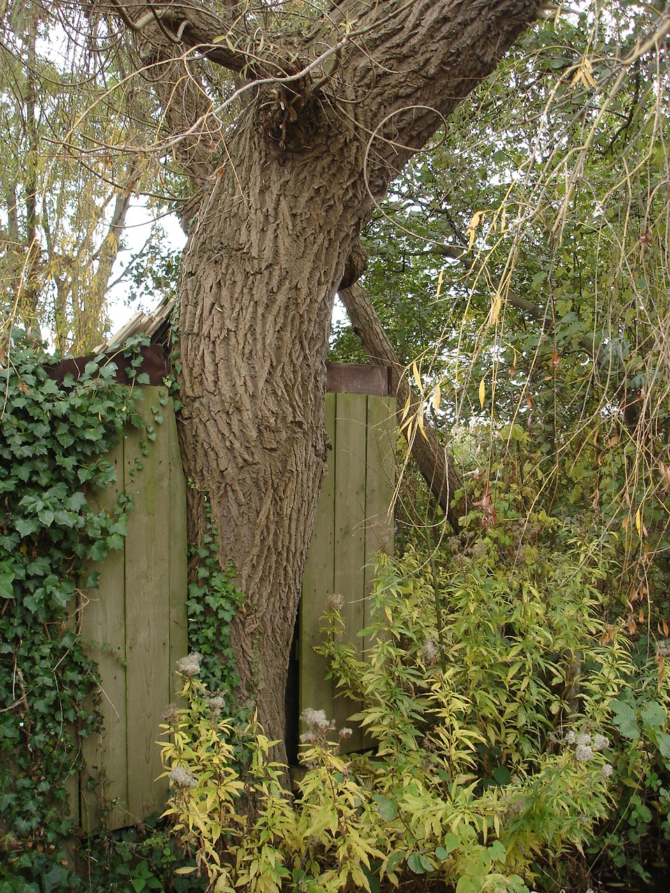 Wilgeboom ingeboud in een schuur.