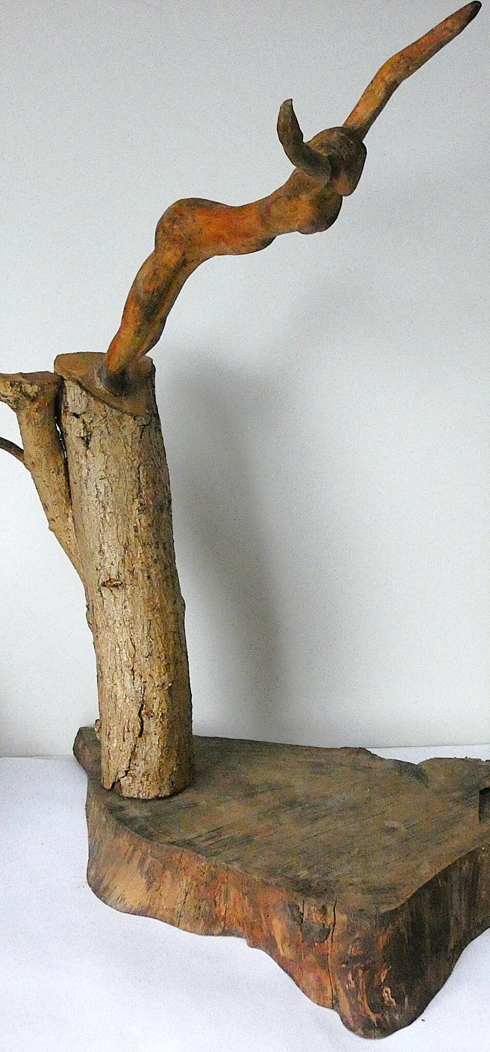 Beeld van een vrouw die in het water duikt. Gesneden uit een krulwilgentak van een krulwilg uit onze achtertuin. De stam waarop de vrouw staat is van essenhout, het 'water' waar ze in duikt is van eikenhout. De afmetingen zijn inclusief de sokkel.
