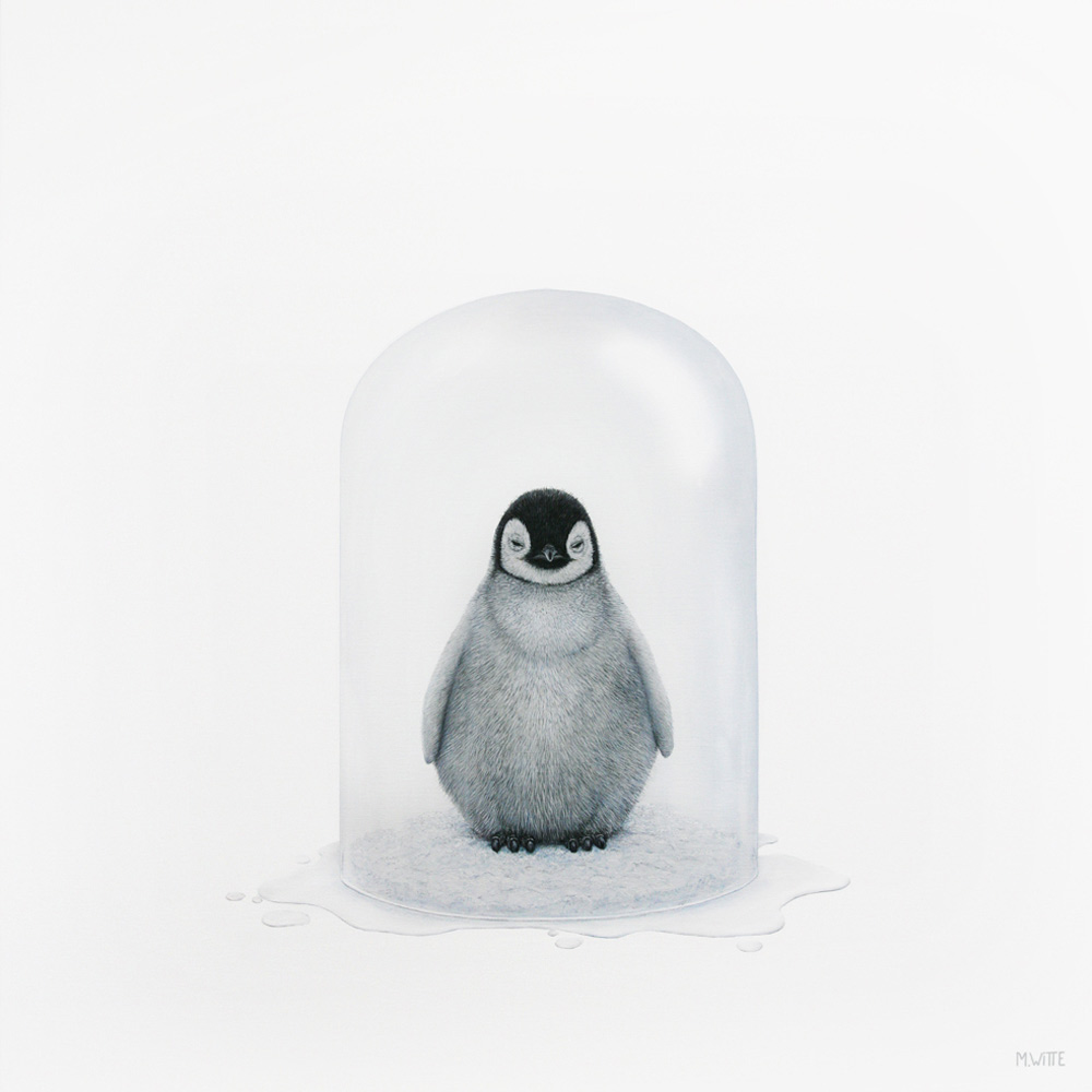Kuiken van een Keizerpinguin onder glazen stolp. Het beeld is een verwijzing naar de opwarming van de aarde.