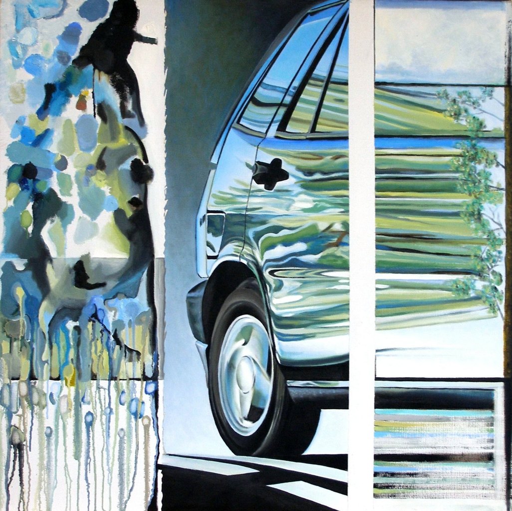 Schilderij Figuratie Groen Techniek Olieverf Oilpainting Natuur Bomen Green Auto Realisme Car Realism Of Reflectie Snelheid Conceptueel Fast Verkeer Reclame Traffic Nature Trees Palet Verpakking
