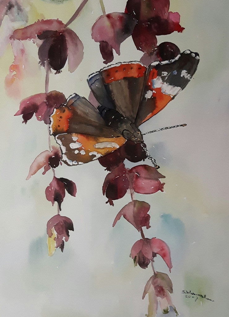 Zomers stilleven waarbij een vlinder in rust op een bloem haar kleurenpracht laat zien. Uitgevoerd in aquarelverf en Oost Indische inkt.